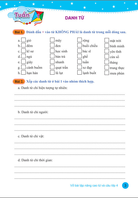 Phần 1: BÀI TẬP. Phần này được biên soạn theo từng mục tiêu ứng với từng tuần học trong chương trình, sách giáo khoa Tiếng Việt 4 - Cánh Diều. Với hệ thống bài tập đa dạng, ngữ liệu mới mẻ được chọn lọc cẩn thận nhằm giúp học sinh rèn luyện, phát triển kiến thức, kĩ năng dùng từ, đặt câu, sử dụng dấu câu và biện pháp tu từ hiệu quả.