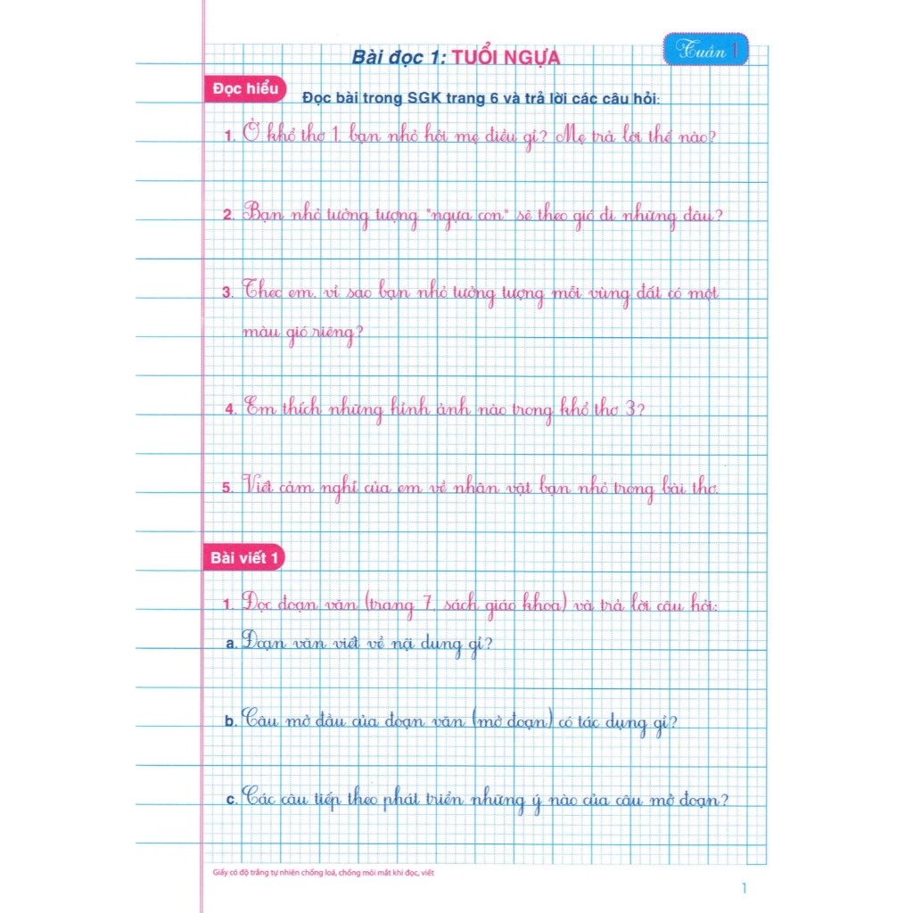 Với 2 bài học, mỗi tuần gồm các câu hỏi và bài tập được trình bày trên giấy ô li bằng kiểu chữ tiểu học hiện hành sẽ giúp các em vừa rèn được kĩ năng trả lời câu hỏi vừa rèn viết chữ được sạch, đẹp, trình bày rõ ràng.