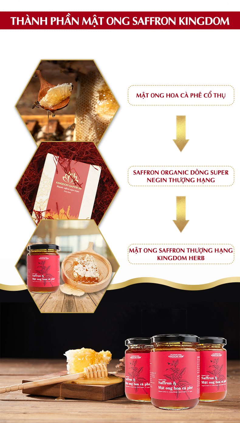 - Thành phần: saffron nhụy hoa nghệ tây super negin Organic và mật ong hoa cà phê nguyên chất 100%