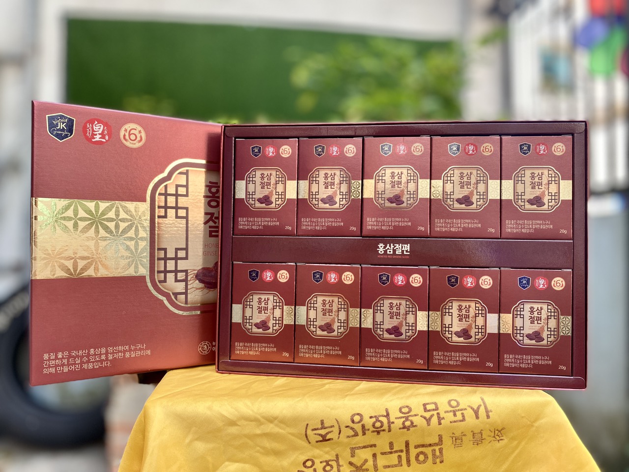 THÔNG TIN SẢN PHẨM - Tên sản phẩm: Hồng Sâm Hàn Quốc Cắt Lát Tẩm Mật Ong Thượng Hạng KGC Jung Kwan Jang (20g x 12 gói) - Hồng sâm Hàn Quốc cắt lát tẩm