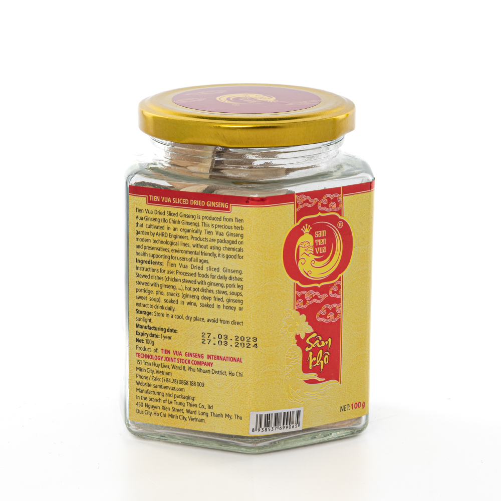 - THÔNG TIN SẢN PHẨM Tên sản phẩm: Sâm Tiến Vua khô thái lát Sản xuất tại: Việt Nam Đóng gói: Đựng trong hũ thủy tinh, được cán màng seal nhôm Thành phần: Rễ (củ) Sâm Tiến Vua sấy khô 100% Khối lượng: 100g HSD: 1 năm kể từ ngày sản xuất