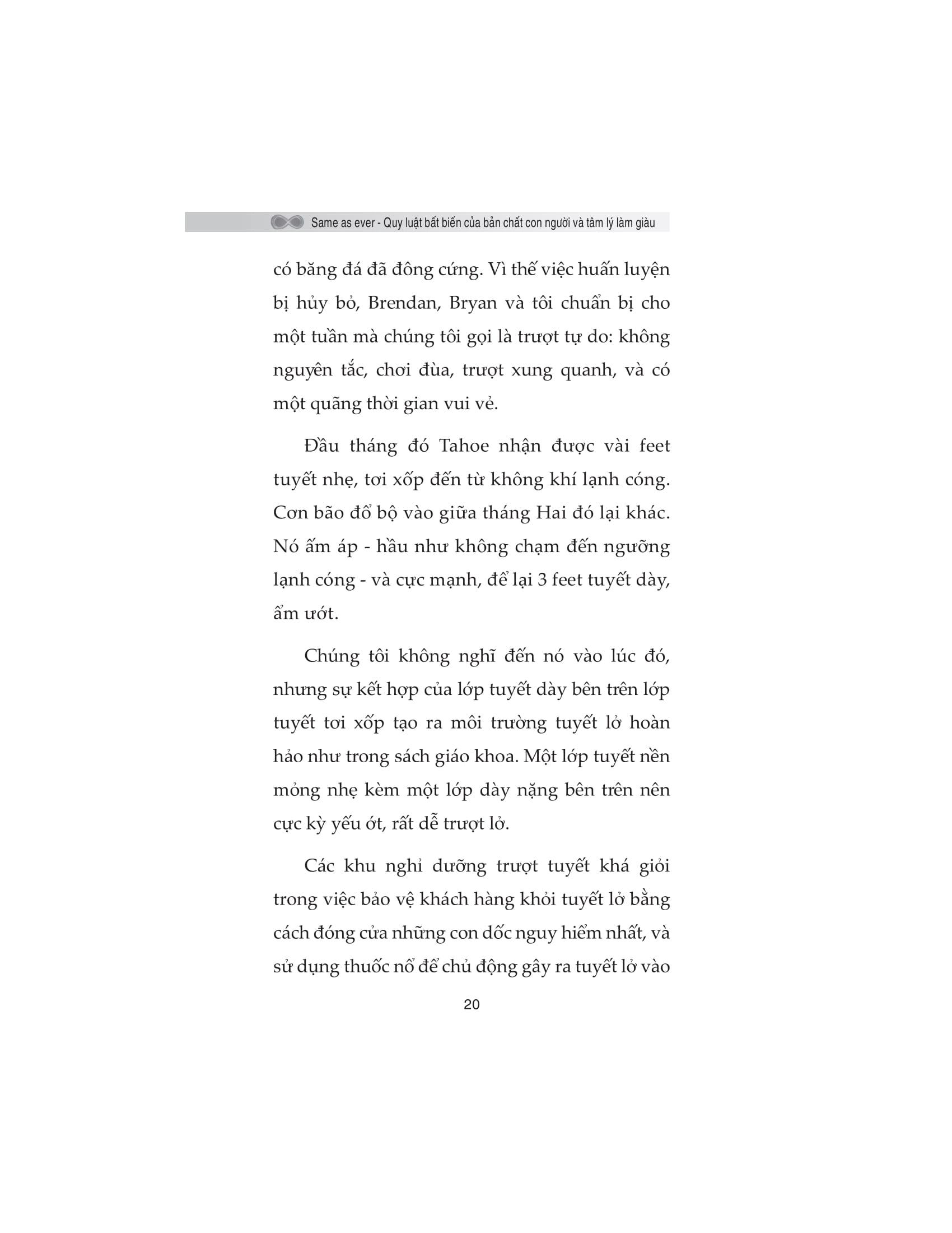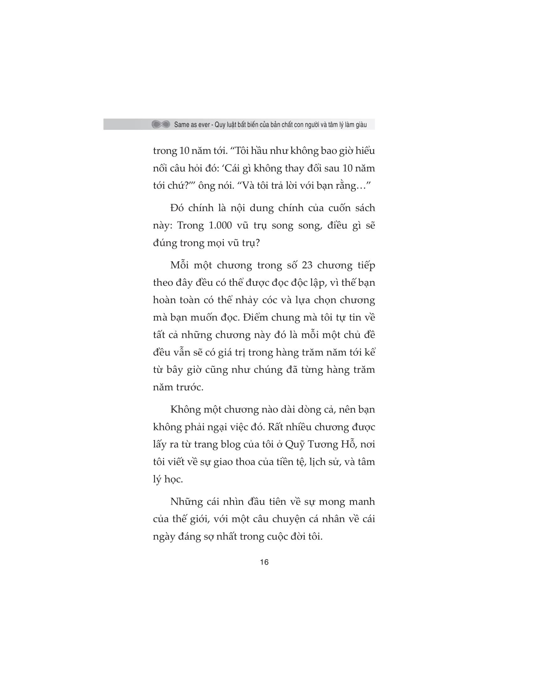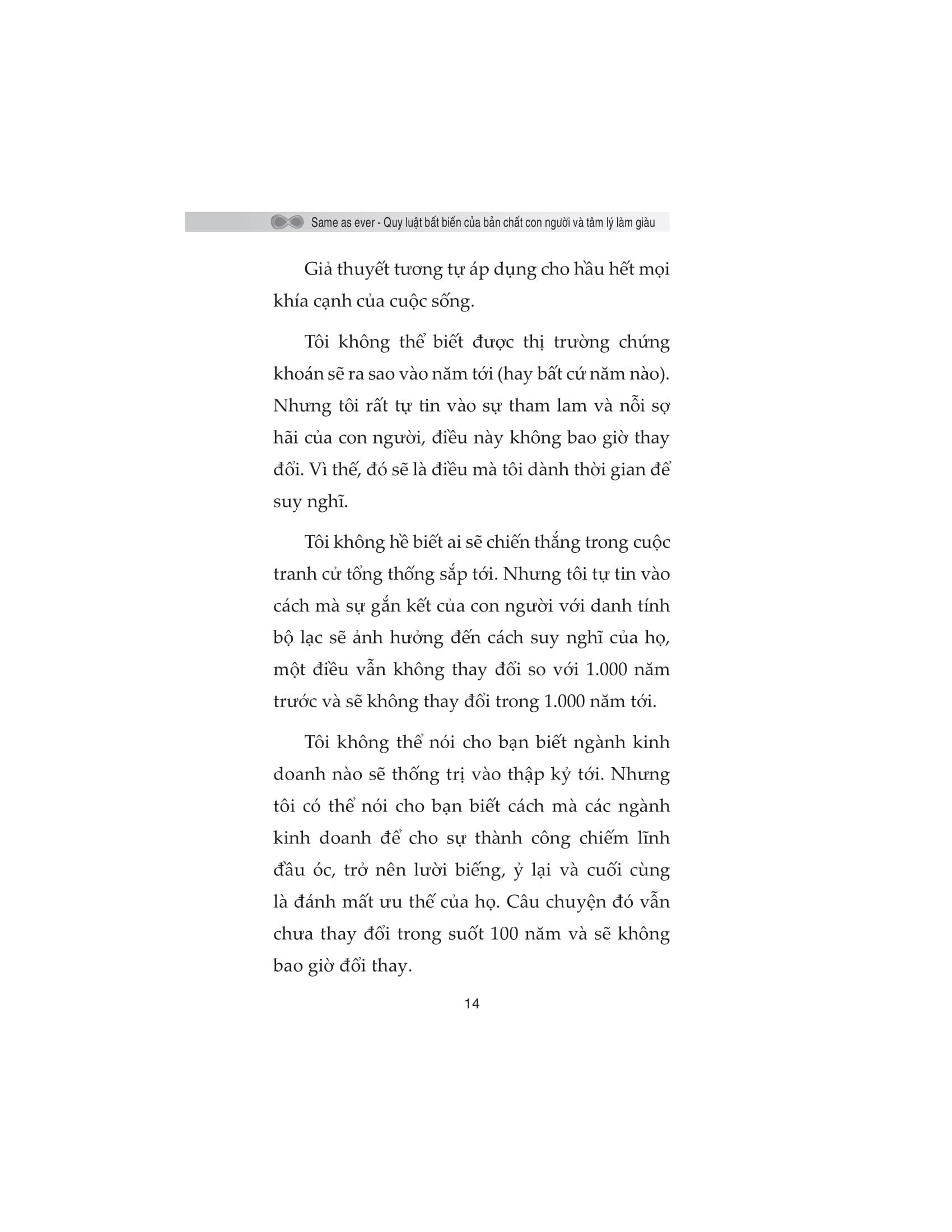 Trong cuốn sách “Same as ever: Quy luật bất biến về bản chất con người và tâm lý làm giàu” tác giả Morgan Housel đưa ra những bài học về kiểm soát rủi ro, nắm bắt cơ hội và sống cuộc sống tốt nhất. Thông qua một chuỗi các câu chuyện hấp dẫn và những ví dụ dễ hiểu, Morgan Housel chỉ ra cách chúng ta có thể sử dụng quy luật không bao giờ thay đổi để nhìn rõ hơn về bối cảnh không chắc chắn của tương lai, tập trung vào những gì là sự thật vĩnh viễn.