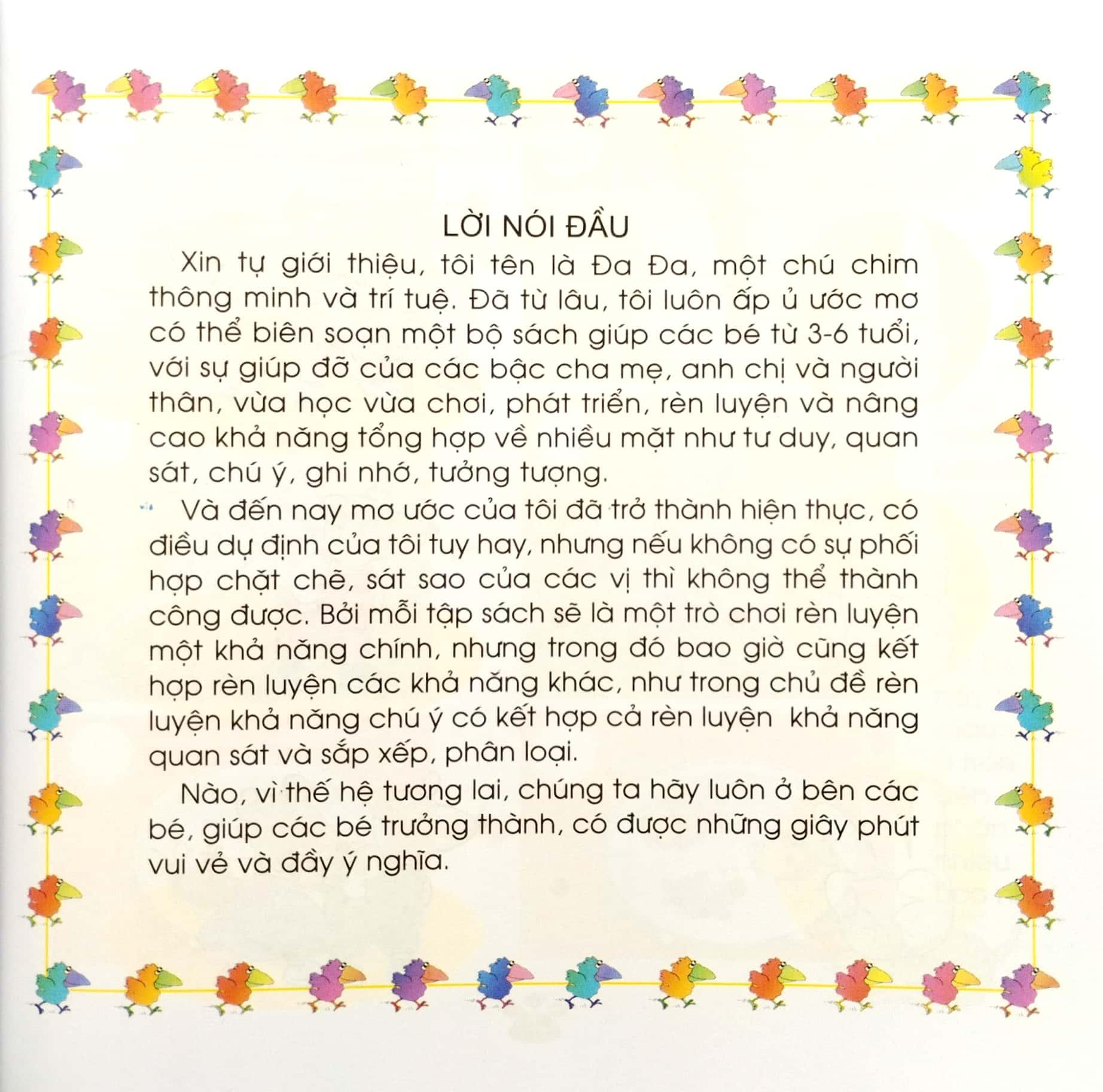 Và đến nay mơ ước của tôi đã thành hiện thực, có điều dự định của tôi tuy hay nhưng nếu không có sự phối hợp chặt chẽ, sát sao của các vị thì không thể thành công được. Bởi mỗi tập sách sẽ là một trò chơi rèn luyện một khả năng chính, nhưng trong đó bao giờ cũng kết hợp rèn luyện các khả năng khác, như trong chủ đề rèn luyện khả năng chú ý có kết hợp cả rèn luyện khả năng quan sát và sắp xếp, phân loại. Nào, vì thế hệ tương lai, chúng ta hãy luôn ở bên các bé, giúp các bé trưởng thành, có được những giây phút vui vẻ và đầy ý nghĩa.