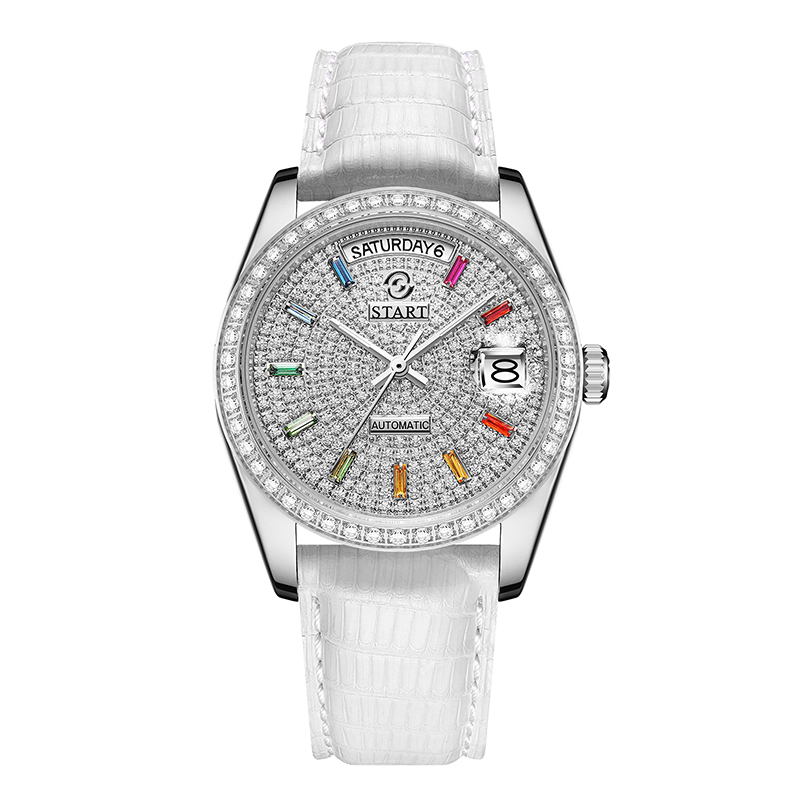 ★Thương hiệu:START★Đặc điểm: Mặt số nạm kim cương, kim cương cầu vồng,ngày,TuầnKhả năng chống thấm nước: 50 mét không thấm nướcLoại lõi đồng hồ: Lõi đồng hồ cơ học tự độngĐường kính vỏ đồng hồ: 36mm (...