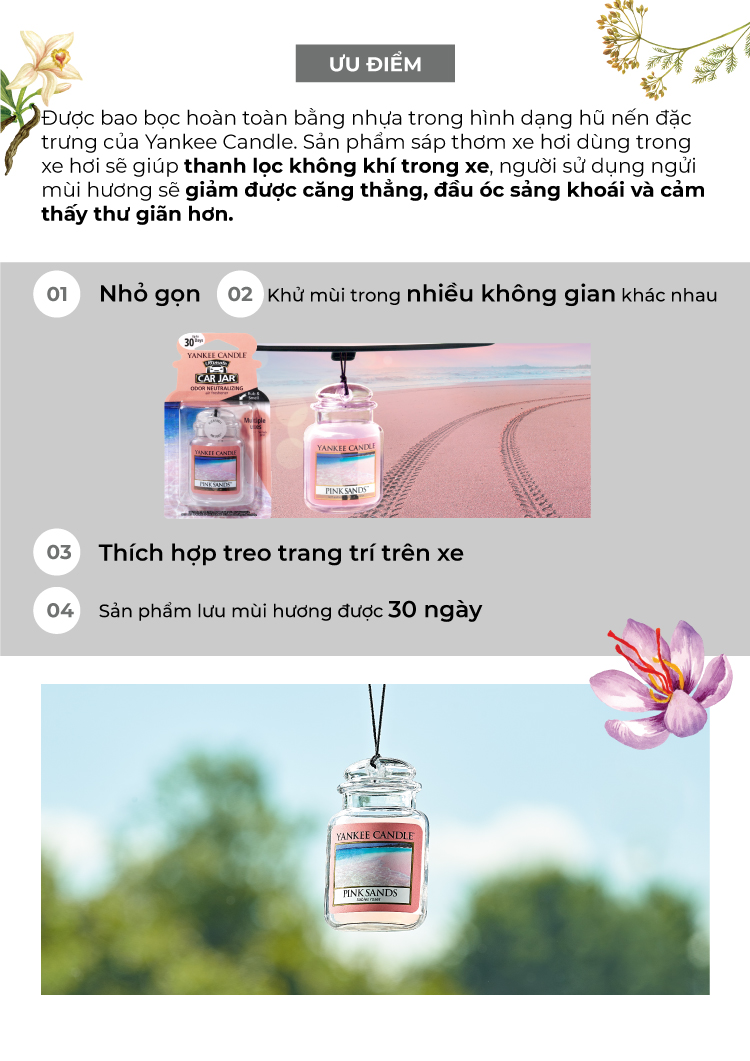 Sáp làm thơm không gian nội thất ô tô một cách nhanh chóng, khiến tinh thần sảng khoái hơn và tránh say xe. Các nguyên liệu chiết xuất hoàn toàn từ thiên nhiên, được nhập