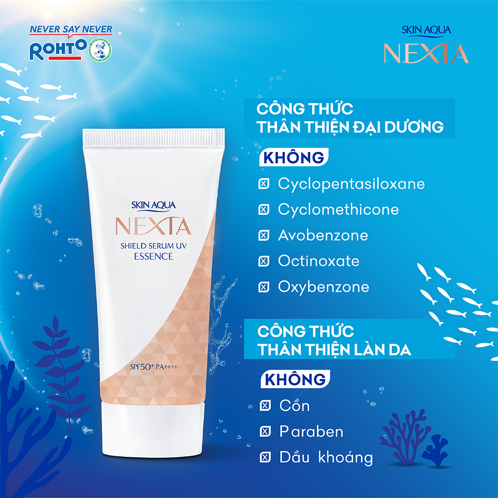 Mua tại TiktokTinh chất serum chống nắng Skin Aqua Nexta Shield Serum UV Essence SPF50+ PA++++ 50g Serum chống nắng ngăn sạm, nám da Skin Aqua Nexta là dòng sản phẩm chống nắng cao cấp phù hợp với làn da của phụ nữ 25+. Sản phẩm với màng chống nắng thế hệ mới thân thiện với làn da và môi trường, kết hợp 8 thành phần dưỡng da cao cấp trong serum để tạo lớp màng chống nắng hiệu quả, bền chắc trên da, ngăn da không bị khô sạm, ngăn ngừa lão hóa, đốm nâu, tàn nhang và phù hợp với cả làn da nhạy cảm nhất. Thành phần: