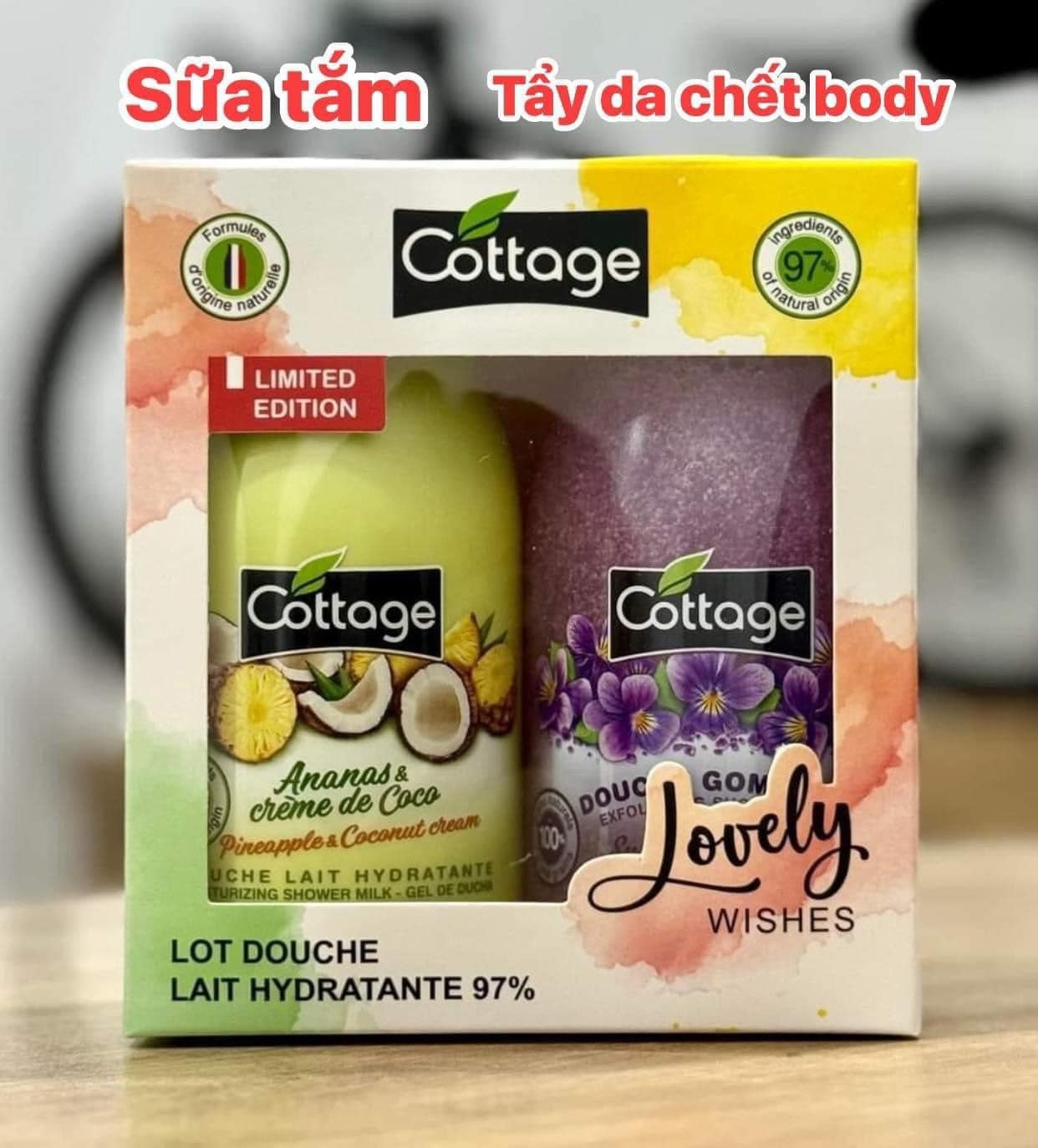 Cottage Set 2 chai sữa tắm kèm tẩy tế bào chết Pháp 250ml + 270ml là sản phẩm thuộc thương hiệu Cottage danh tiếng của Pháp, được thiết kế dành riêng cho những ai yêu thích sự tinh tế và sang trọng trong trải nghiệm tắm gội.   Đặc điểm nổi bật: – Công thức độc đáo: Kết hợp hài hòa giữa các thành phần dưỡng chất quý giá từ thiên nhiên cùng công nghệ hiện đại, Cottage Set mang đến hiệu quả làm sạch da vượt trội, đồng thời nuôi dưỡng da mềm mại, mịn màng từ sâu bên trong. – Hương thơm quyến rũ: Lấy cảm hứng từ những loài hoa cỏ quý hiếm tại Pháp, Cottage Set sở hữu đa dạng các mùi hương tinh tế, nhẹ nhàng, lưu giữ dài lâu trên cơ thể, mang đến cho bạn những giây phút thư giãn tuyệt vời sau mỗi lần sử dụng. – Thiết kế sang trọng: Sản phẩm được thiết kế với chai dạng pump tiện lợi, cùng dung tích 250ml cho sữa tắm và 270ml cho tẩy tế bào chết, đáp ứng nhu cầu sử dụng trong thời gian dài .