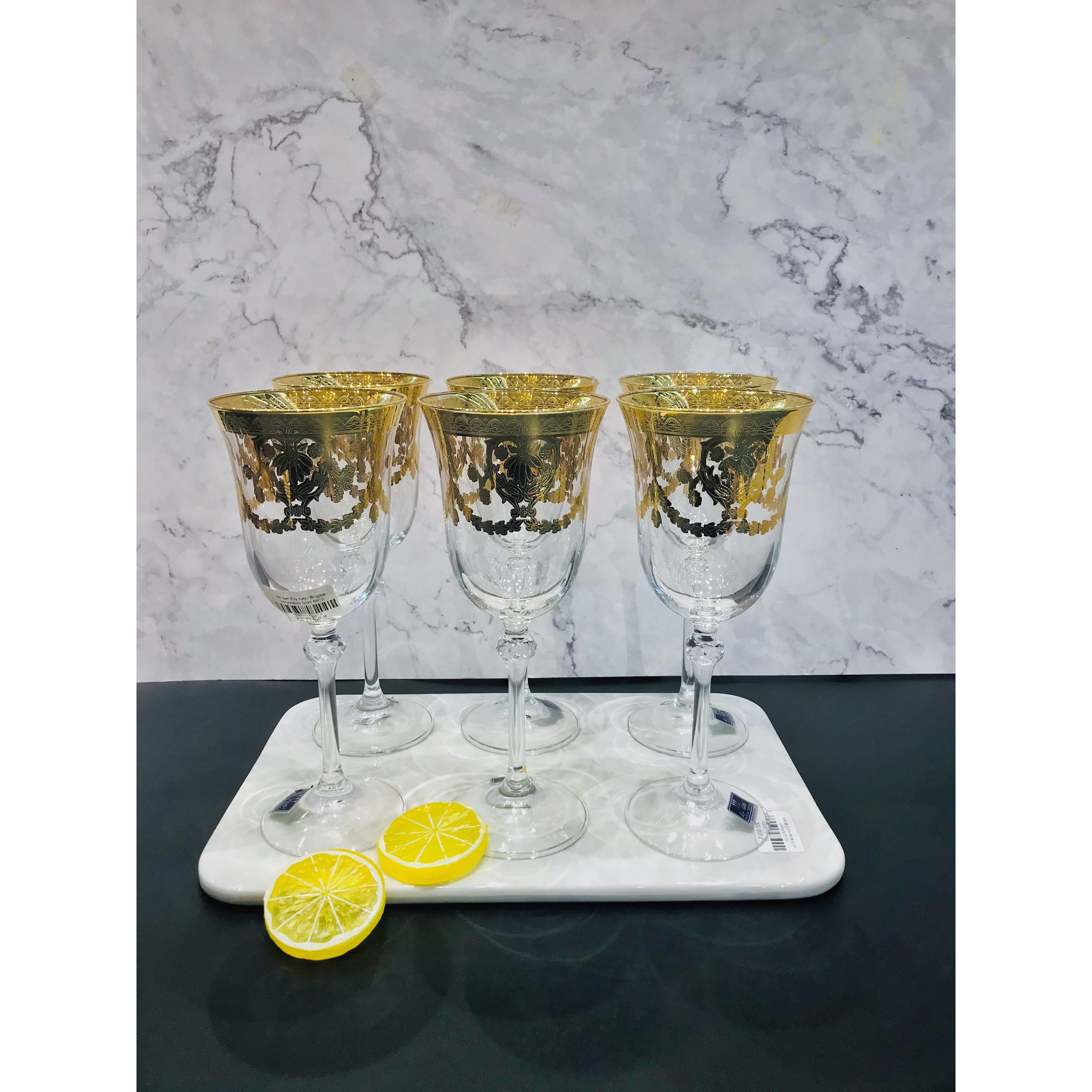 Kích thước: 6ly, 150ml/ly Miêu tả: Bộ gồm 6 ly. Họa tiết chạm khắc tinh tế, viền vàng 24k sang trọng đẳng cấp. Màu sắc: Vàng, trắng Chất liệu: Pha lê mạ vàng 12 carat