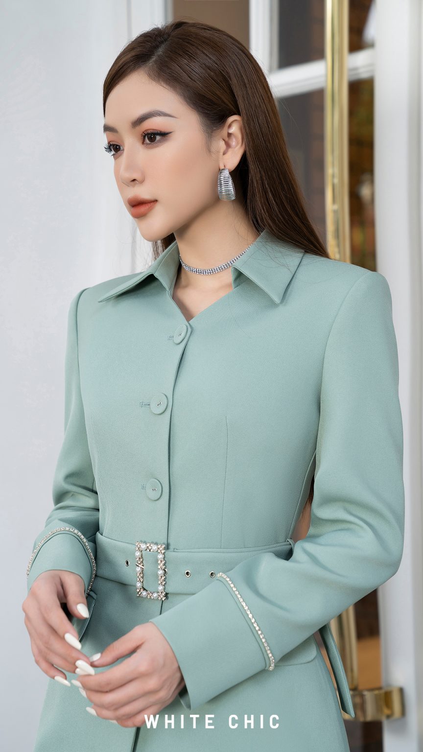 Thiết kế chạm tới sự thanh khiết và trang nhã với sắc xanh mint dịu mắt, tôn lên dáng vẻ dịu dàng nhưng không kém phần sang trọng, sắc sảo của quý cô hiện đại. Thiết kế áo cổ đức thanh lịch, gấu áo ôm tròn trẻ trung, túi ốp đặc trưng được đặt để hợp lí tạo điểm nhấn độc đáo cho tổng thể. Phần chân váy cạp rời xoè nhẹ vừa vặn tôn dáng và đường dập ly cầu kì mang đến sự nhẹ nhàng và uyển chuyển theo từng nhịp bước. Set đồ sử dụng lối hoà sắc ton-sur-ton, đặc biệt tạo điểm nhấn với dây lưng có gắn phụ kiện ôm sát cơ thể, tạo cảm giác tôn eo, che khuyết điểm vòng hai, thể hiện sự tinh tế gửi gắm trong từng chi tiết nhỏ. Sản phẩm phù hợp diện đi tiệc, hẹn hò, dạo phố cùng bạn bè, gia đình. Có thể kết hợp cùng giày cao gót và các phụ kiện đi kèm.