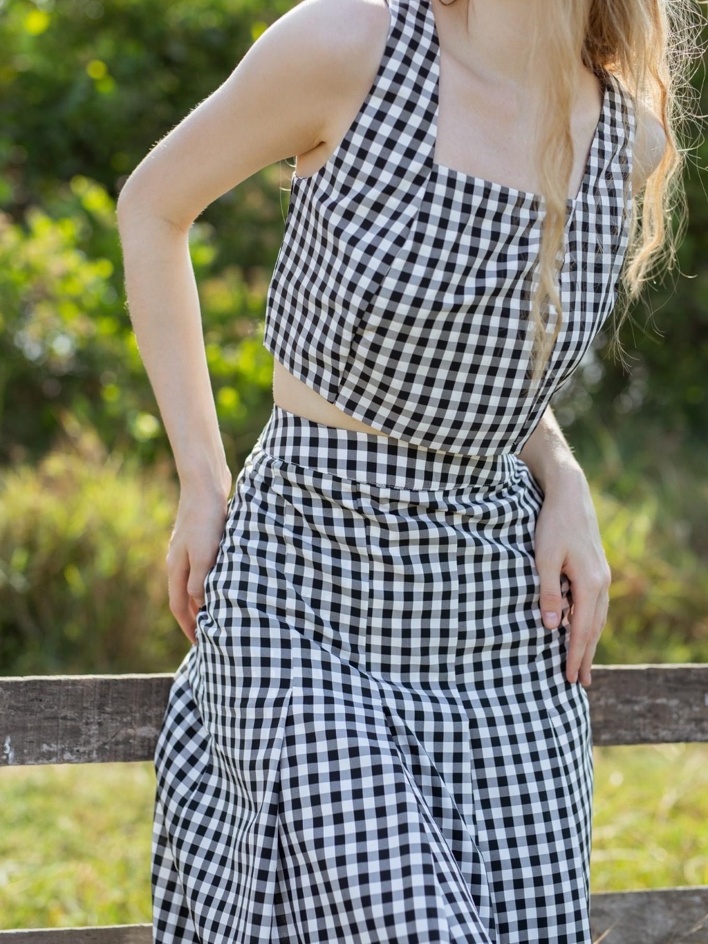 Áo Dây Eo Phối Bèo Đen (AB323) | Chân Váy Caro (VB326)