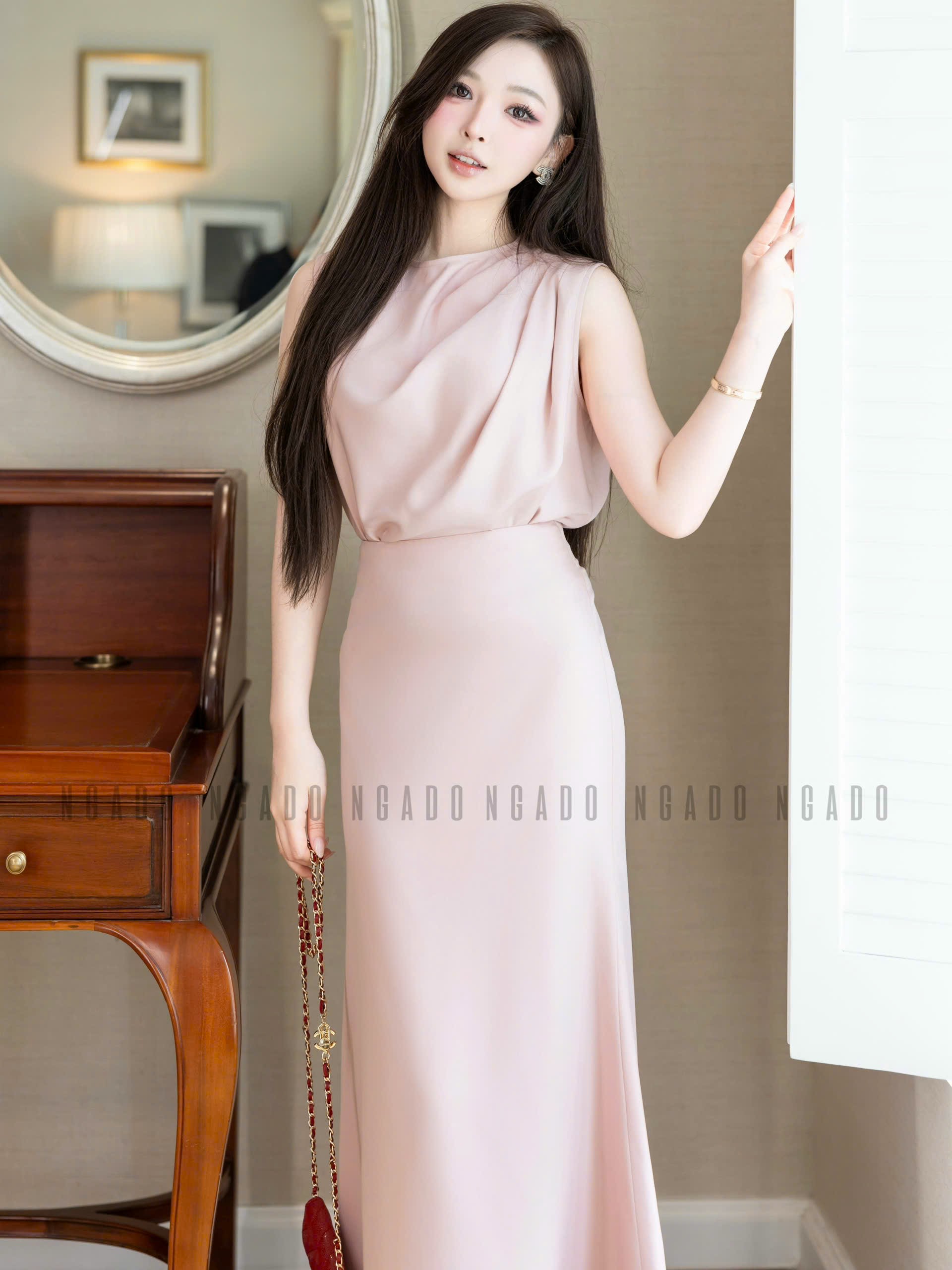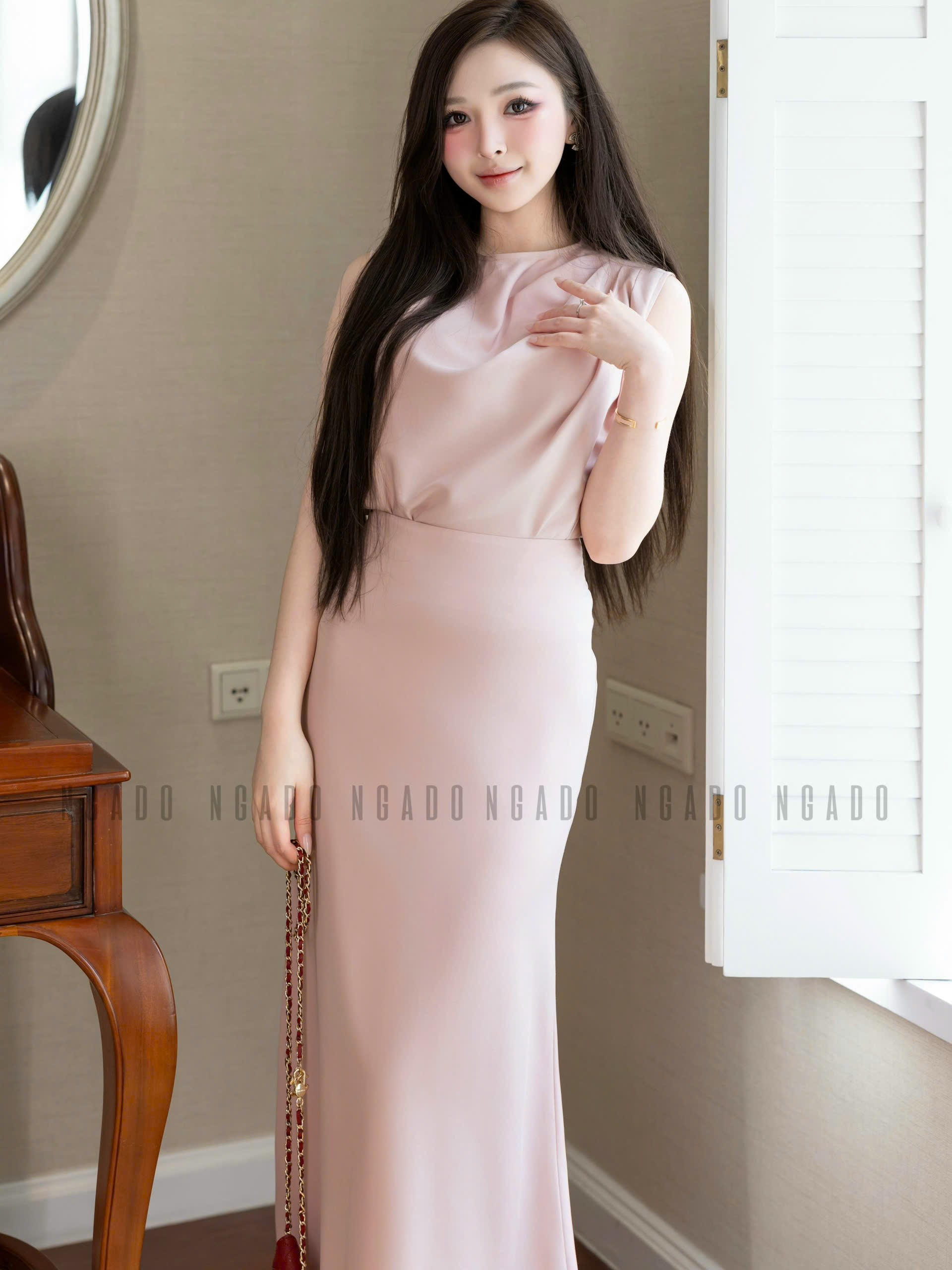 ✨Set áo váy hồng sát nách xếp ly NGADO , set áo váy dài , set áo váy hồng