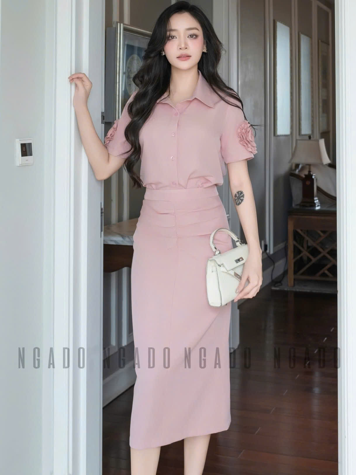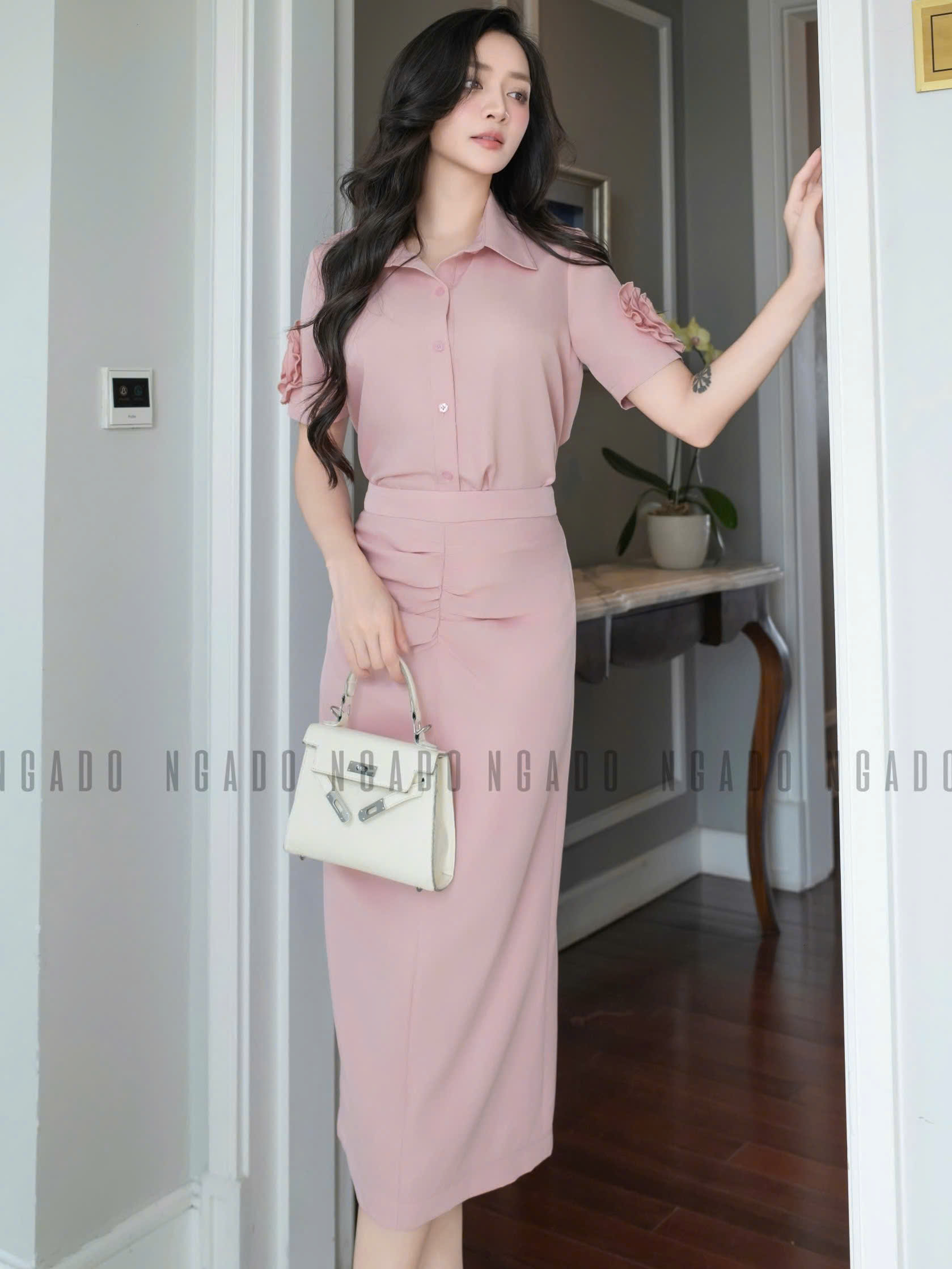 ✨Set áo váy hồng tay hoa NGADO , set áo váy dài , set áo váy kiểu Nữ