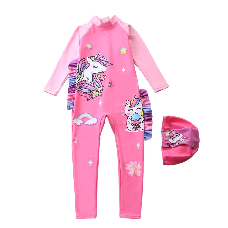 Đồ bơi bé gái liền thân dài full body chống nắng, chất vải mềm mại, họa tiết kỳ lân rất được các bé yêu thích. Chất liệu vải thun co dãn tốt, thoát nước nhanh