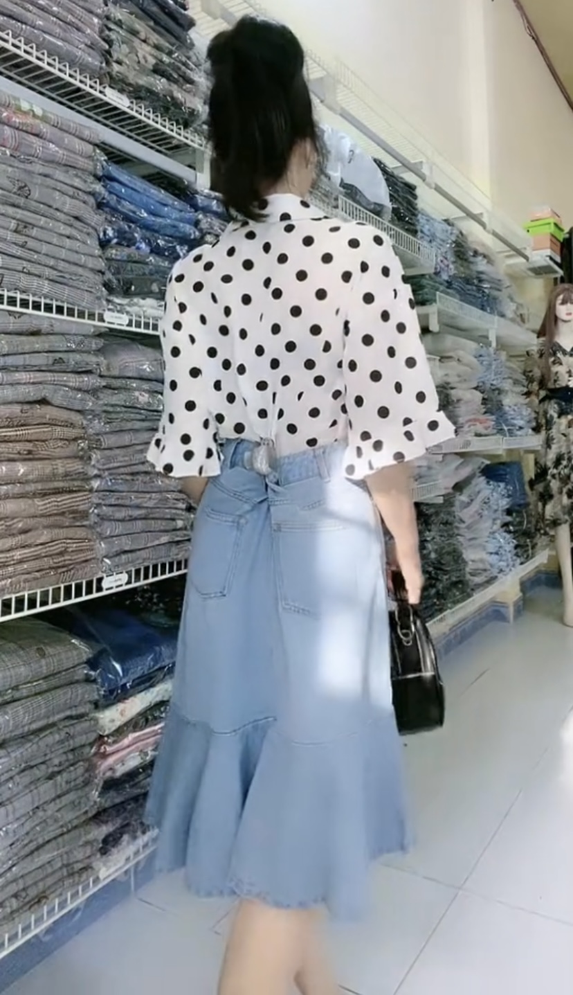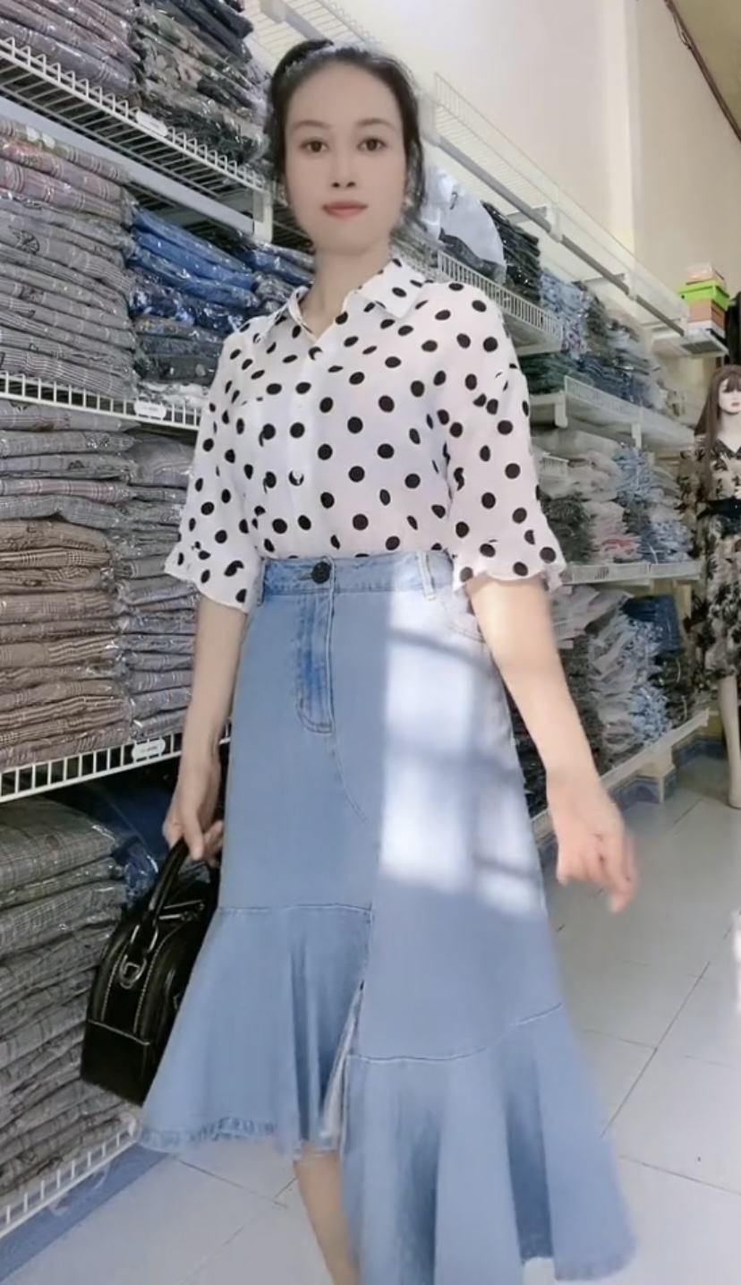 Set sơ mi chấm bi và váy đuôi cá bất đối xứng Mã: SVZBG001 Màu: Xanh + Trắng chấm bi đen Chất liệu: Denim, linen Số đo vòng1 - vòng2(cm): 91 giãn nhẹ - 74