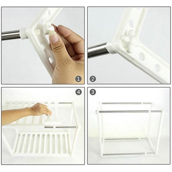 Mua tại TiktokThiết kế thông minh có thể thay đổi nhiều kiểu khác nhau tùy theo vị trí lắp đặt. Phù hợp lắp dưới bồn rửa chén hoặc bồn rửa mặt giúp tận dụng tối đa diện tích để đồ. Cho không gian sống luôn gọn gàng, ngăn nắp. Kệ có nhiều tầng; dùng để úp chén; dĩa hoặc để đồ… cho ráo nước; tránh bụi bẩn; vi khuẩn; ẩm mốc. Chất liệu nhựa và inox cao cấp bền đẹp. Kích thước: 39~70 x 26 x 38cm. Bộ sản phẩm kệ xếp để dưới bồn rửa chén bao gồm: 4 thanh inox, 10 khay nhựa và 2 khung nhựa.