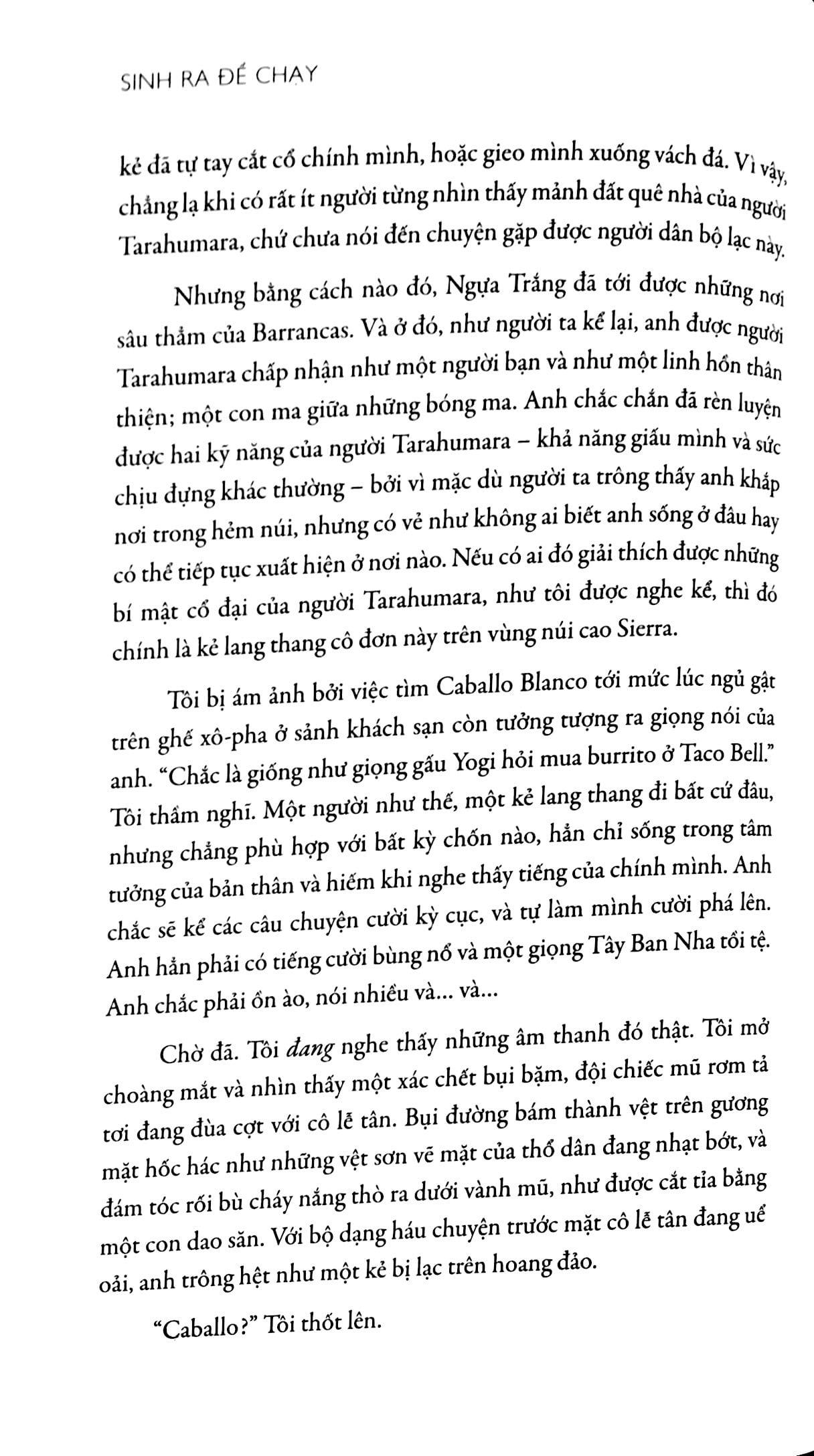 Sống ngăn cách với thế giới qua hẻm núi Copper Canyon (Mexico), người thổ dân Tarahumara đã tôi rèn khả năng chạy bộ hàng trăm dặm không ngơi nghỉ mà không gặp chấn thương nào. Nhà báo kỳ cựu đồng thời cũng là người chạy bộ hay mắc chấn thương Christopher McDougall đã lên đường tìm bí mật của họ. Dọc hành trình, anh đưa người đọc từ phòng thí nghiệm ở Đại học Harvard xuống thung lũng nóng như nung, lên những đỉnh cao buốt giá xuyên miền Bắc Mỹ, quê hương của người chạy bộ siêu phàm đẩy cơ thể đến cực hạn và cuối cùng là cuộc so tài thế kỷ trong hẻm núi Copper Canyon giữa những vận động viên chạy bộ cự phách nhất nước Mỹ và tộc người chạy bộ. Câu chuyện khó tin của McDougall không chỉ cuốn hút trí não mà còn tiếp sinh lực cho cơ thể khi bạn nhận ra từ thẳm sâu bên trong, m.ình được SINH RA ĐỂ CHẠY.