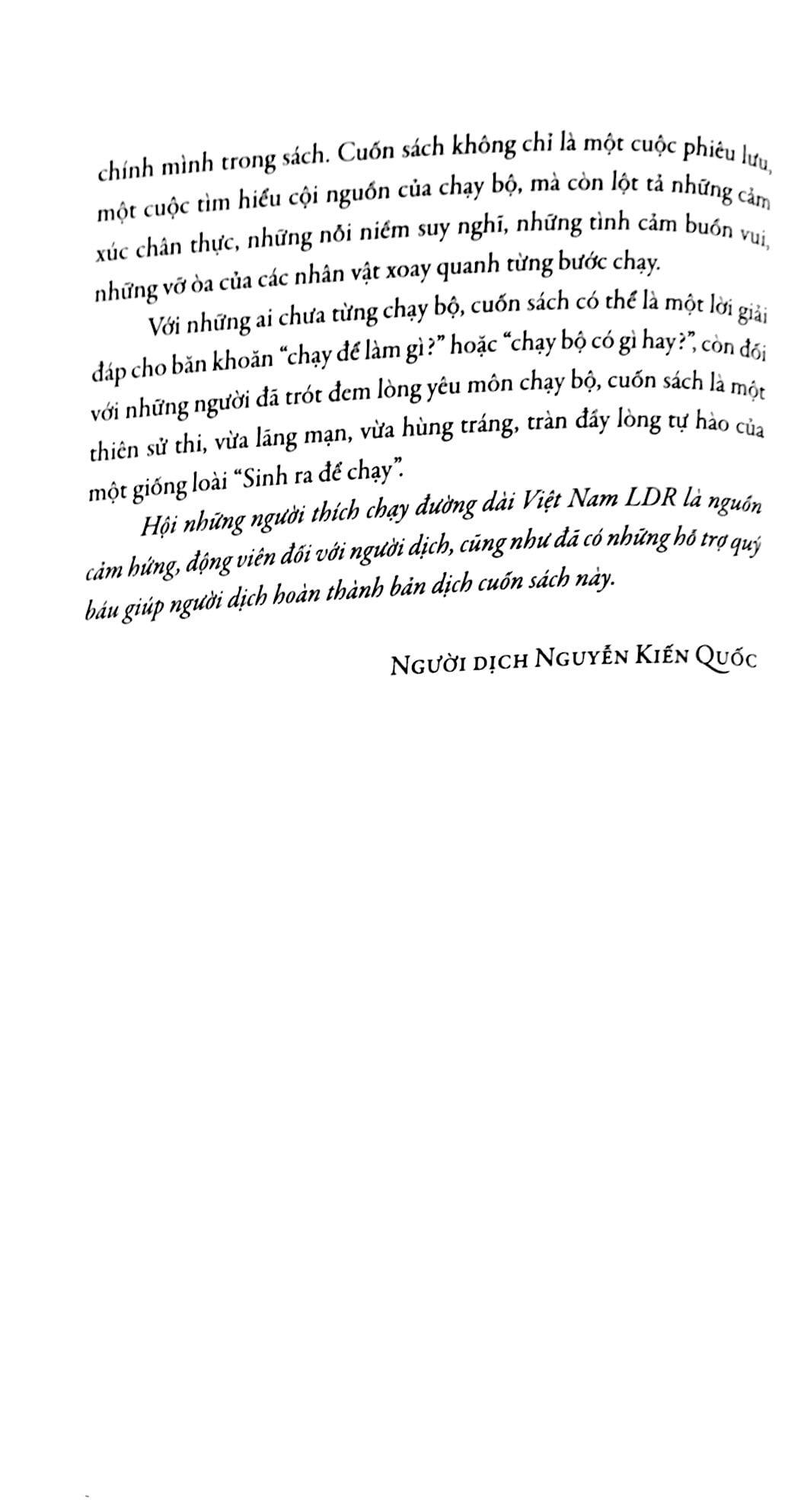 Với những ai chưa từng chạy bộ, cuốn sách có thể là một lời giải đáp cho băn khoăn “chạy để làm gì?” hoặc “chạy bộ có gì hay?”, còn đối với những người đã trót đem lòng yêu môn chạy bộ, cuốn sách là một thiên sử thi, vừa lãng mạn, vừa hùng tráng, tràn đầy lòng tự hào của một giống loài “Sinh ra để chạy”.