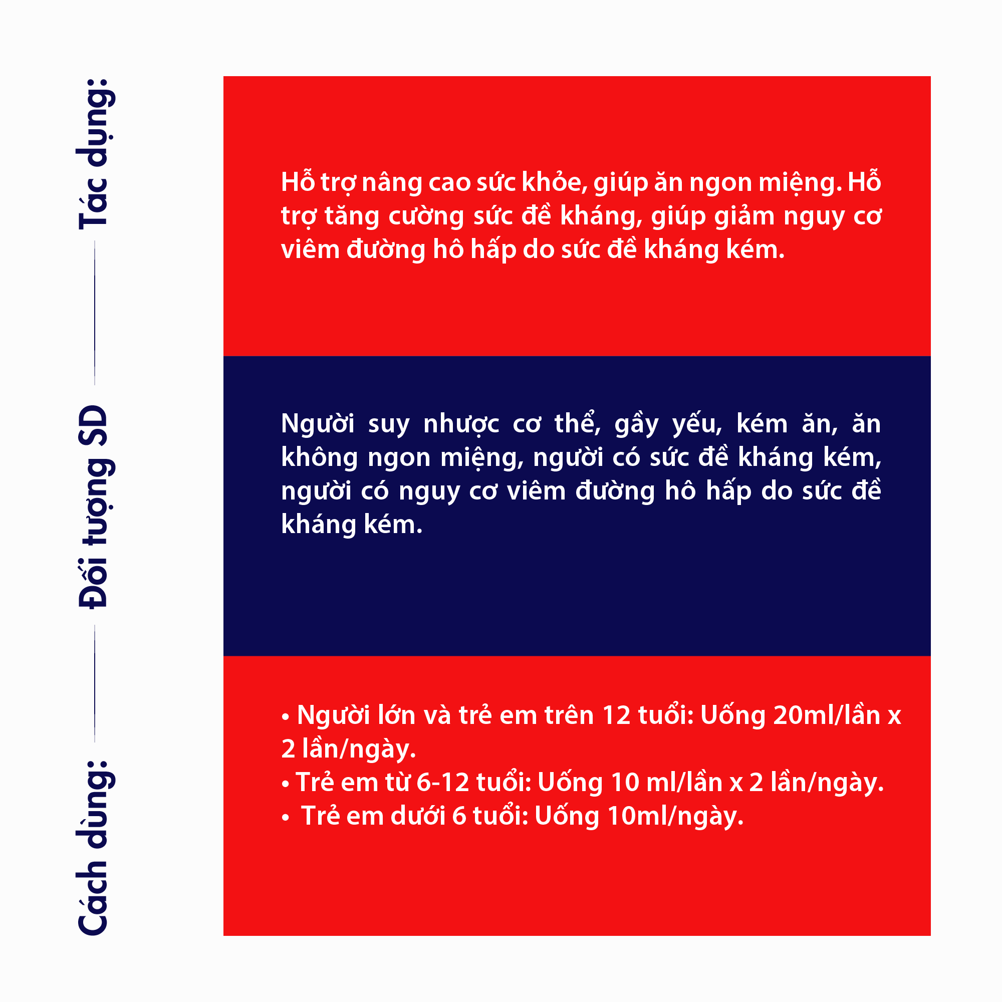 - Trẻ em suy dinh dưỡng, còi xương. Quy cách đóng gói: Hộp 20 ống x 10ml. Bảo quản: