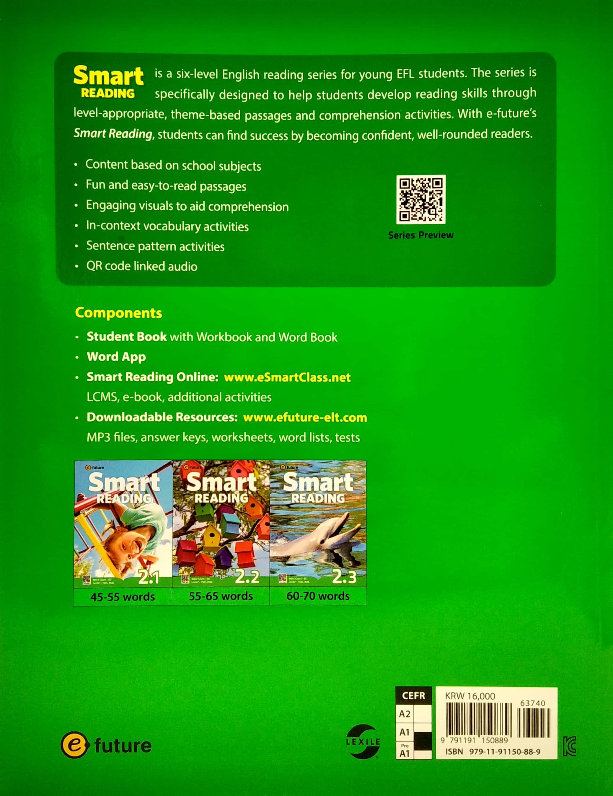 Is a six-level English reading series for young EFL students. The series is specifically designed to help students develop reading skills through level-appropriate, theme-based passages and comprehension activities. With e-future's Smart Reading, students can find success by becoming confident, well-rounded readers.