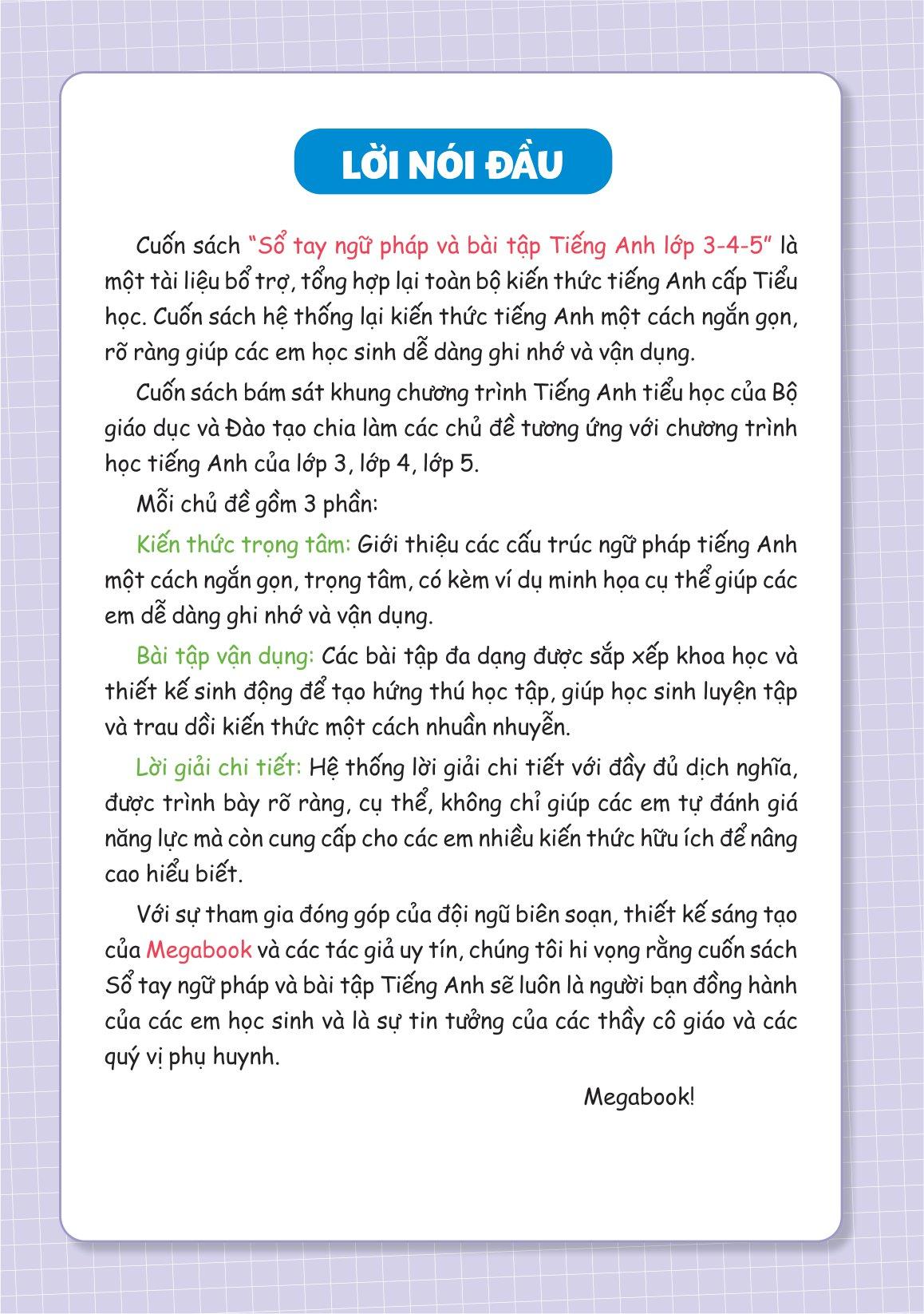 Cuốn sách Sổ tay ngữ pháp và bài tập Tiếng Anh lớp 3-4-5 là một tài liệu bổ trợ, tổng hợp lại toàn bộ kiến thức tiếng Anh cấp Tiểu học. Cuốn sách hệ thống lại kiến thức tiếng Anh một cách ngắn gọn, rõ ràng giúp các em học sinh dễ dàng ghi nhớ và vận dụng.