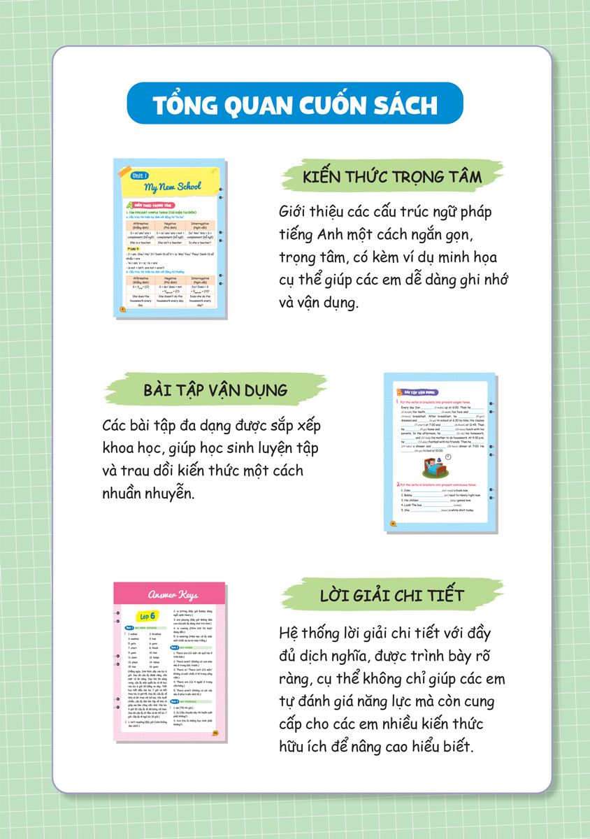 - Sách hệ thống các kiến thức trọng tâm của chương trình học Cuốn sách bám sát khung chương trình Tiếng Anh Trung học cơ sở của Bộ Giáo dục và Đào tạo chia làm các chủ đề tương ứng với chương trình học tiếng Anh của ,, , Cuốn sách giới thiệu các cấu trúc ngữ pháp tiếng Anh một cách ngắn gọn, trọng tâm, có kèm ví dụ minh họa cụ thể giúp các em dễ dàng ghi nhớ và vận dụng.