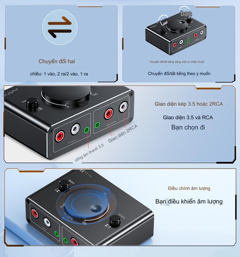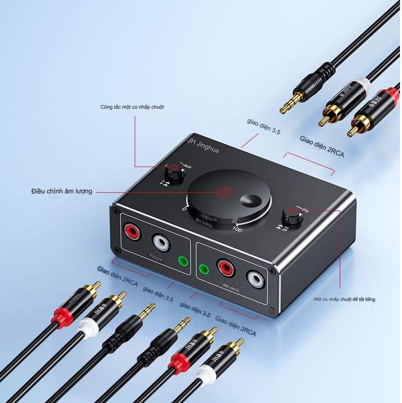 Chức năng 1: kết nối từ 1 thiết bị (dvd, pc, laptop, điện thoại) ra 2 loa, tai nghe, amply cổng 2RCA hoặc Aux 3.5mm