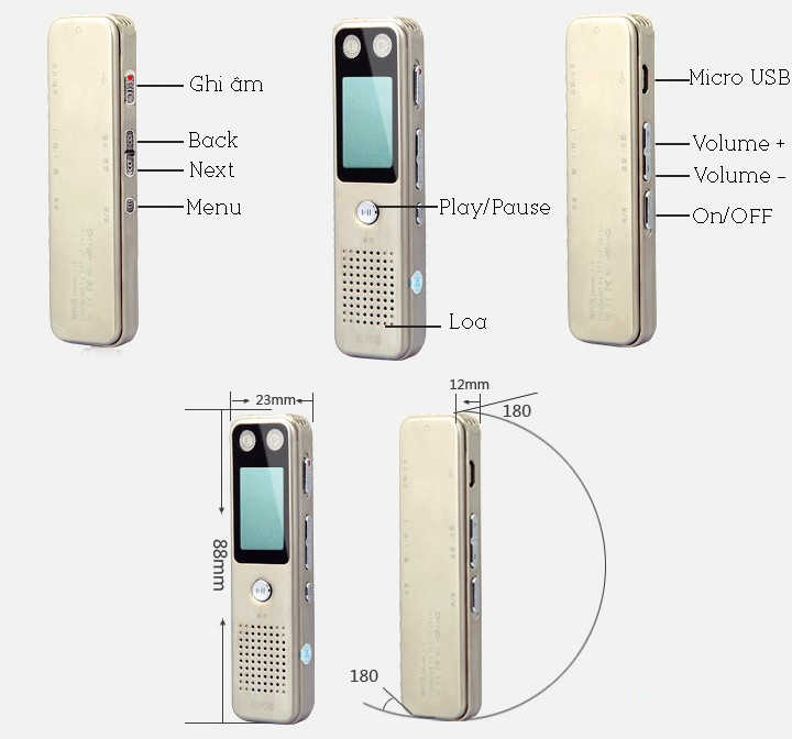 Sự miêu tả: Tên: Máy ghi âm Định dạng ghi: WAV/MP3; Định dạng phát nhạc: WAV/MP3/OGG và các định dạng âm thanh khác; Thời gian ghi pin: khoảng 20 giờ; Pin: pin lithium 210 mAh;