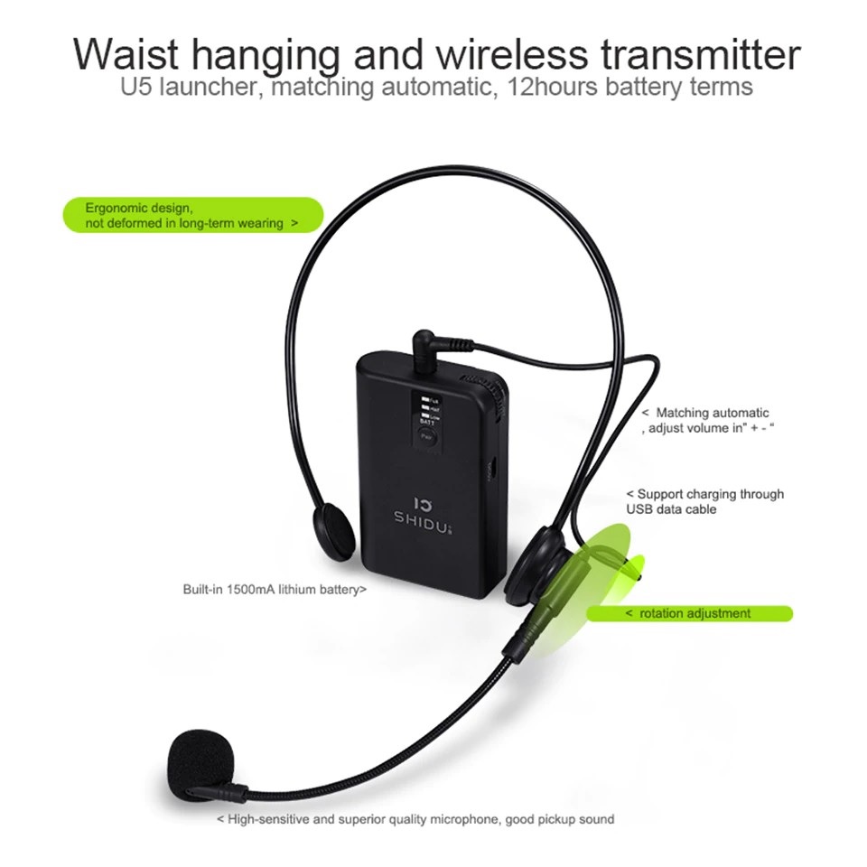 - Hỗ trợ 2 Micro : 1 micro gài tai Shidu U2 và 1 micro cầm tay Shidu U5. Có thể sử dụng được 2 mic đồng thời cho 2 người cùng thuyết trình