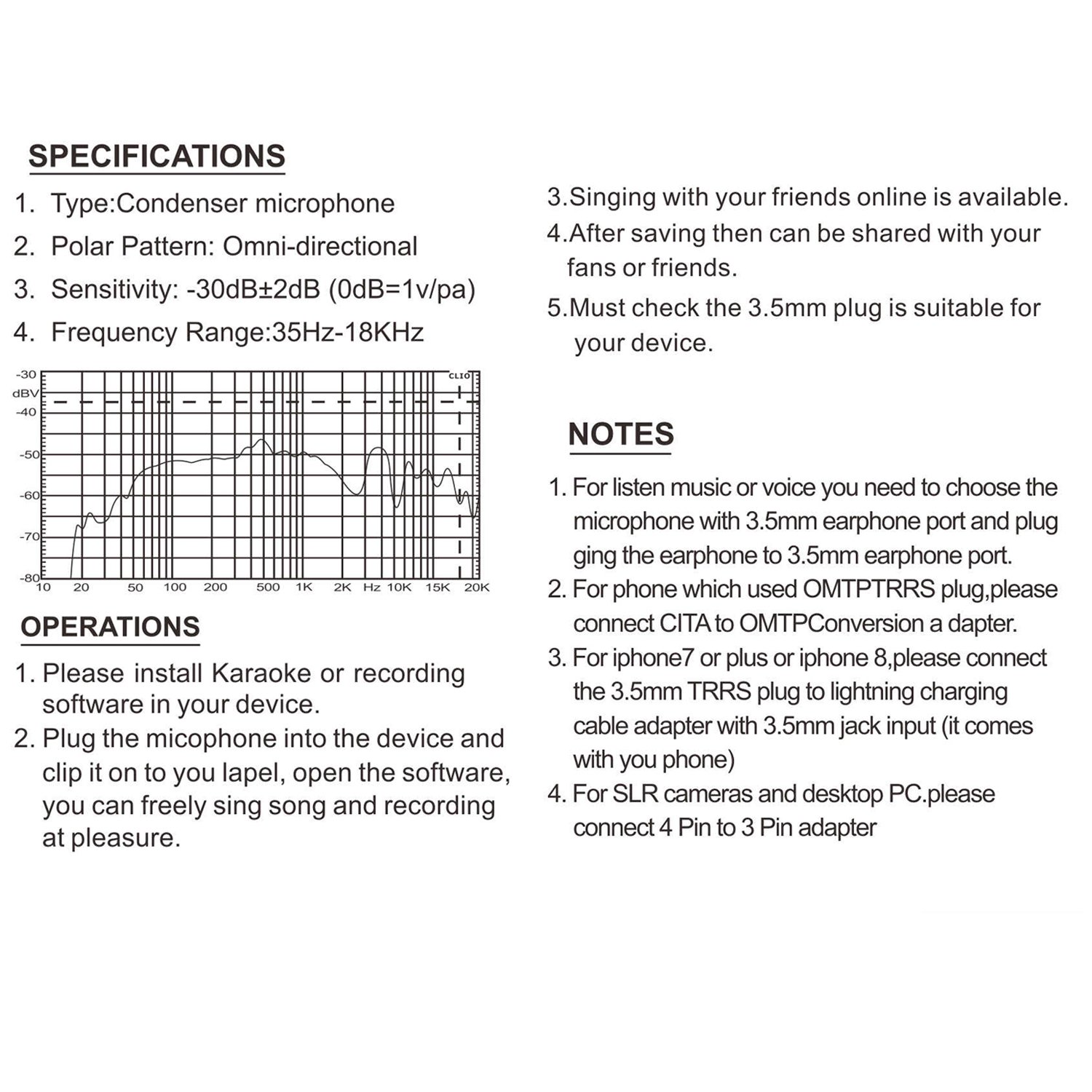 - Nếu micrô không thể ghi âm, chúng tôi khuyên bạn nên thử các phương pháp sau: (1) Rút phích cắm và cắm lại để kiểm tra lại, đảm bảo rằng bộ chuyển đổi đã được cắm đầy đủ. (2) Hãy thử sử dụng nó cho các điện thoại thông minh khác hoặc thiết bị để kiểm tra. (3) Vui lòng tháo micrô ra trước khi bạn phát bản ghi âm. Đặc điểm kỹ thuật và Tính Năng: