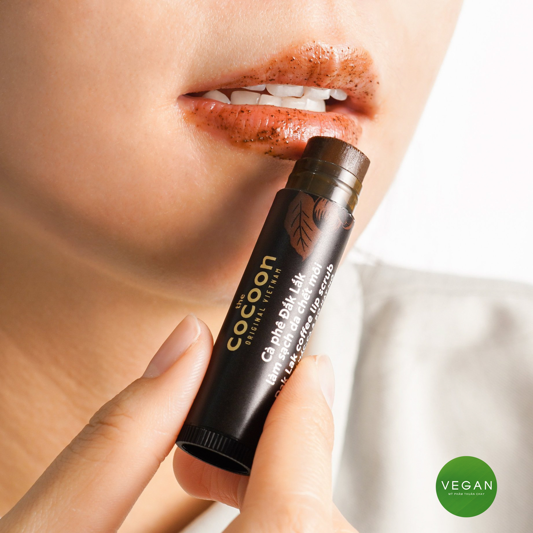 Cà phê đắk lắk làm sạch da chết môi cocoon. những hạt cà phê li ti được rang xay bằng tay hòa quyện vào dầu mắc-ca và bơ hạt mỡ, sẽ nhẹ nhàng làm bong những tế bào da chết ở môi, đem lại làn môi mềm và mịn màng. Công dụng Cà phê đắk lắk làm sạch da chết môi cocoon
