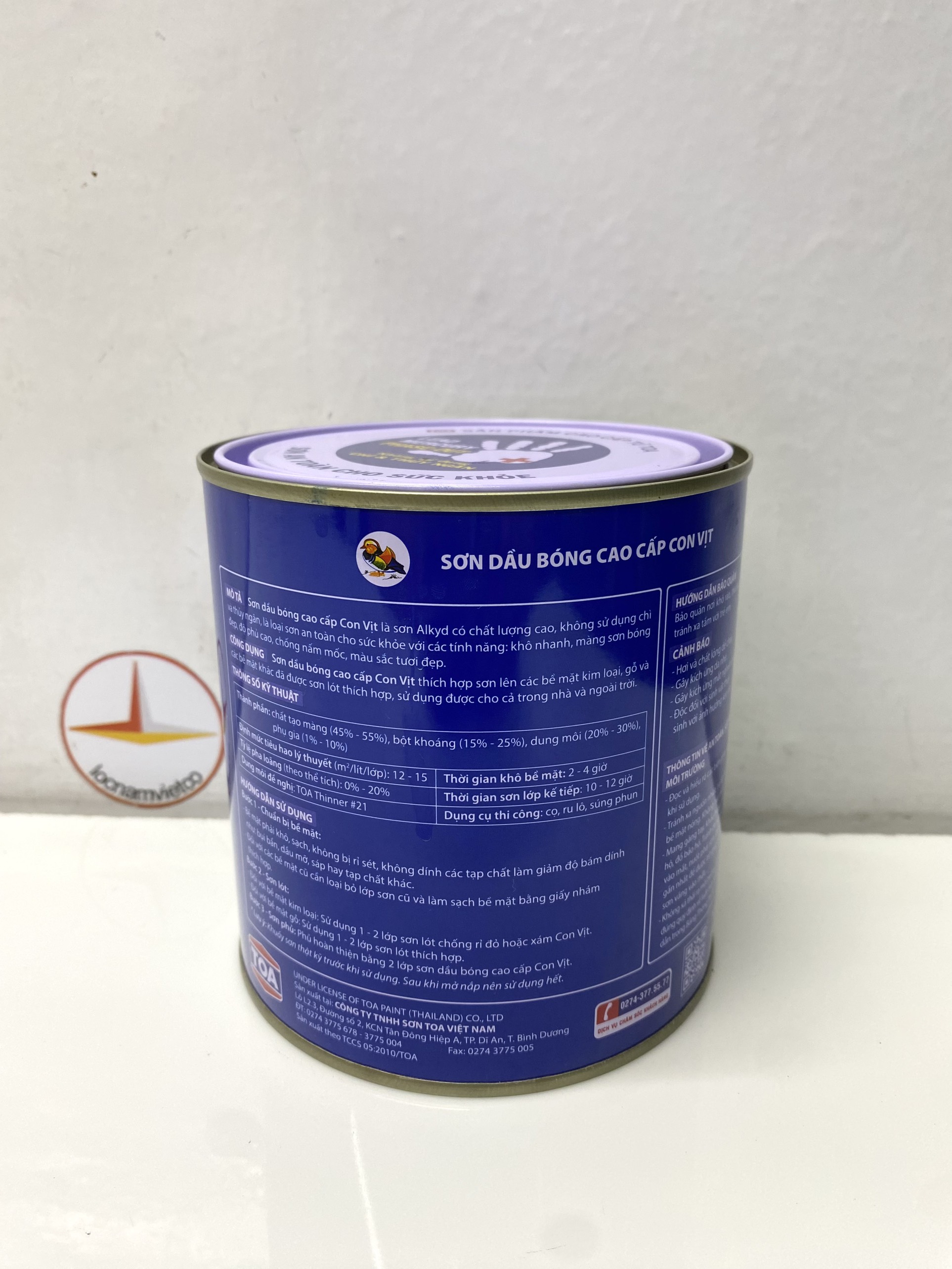 Mua tại TiktokSơn dầu cao cấp Toa hiệu Con Vịt màu xanh ngọc MD118 _800ML Sơn dầu bóng cao cấp Con Vịt (Mandarin Duck) là loại sơn Alkyd chất lượng cao, không sử dụng Chì & chất gây hại, là loại sơn an toàn cho sức khoẻ với các tính năng: Khô nhanh, màng sơn bóng đẹp, độ phủ cao, chống nấm mốc, màu sắc tươi đẹp.