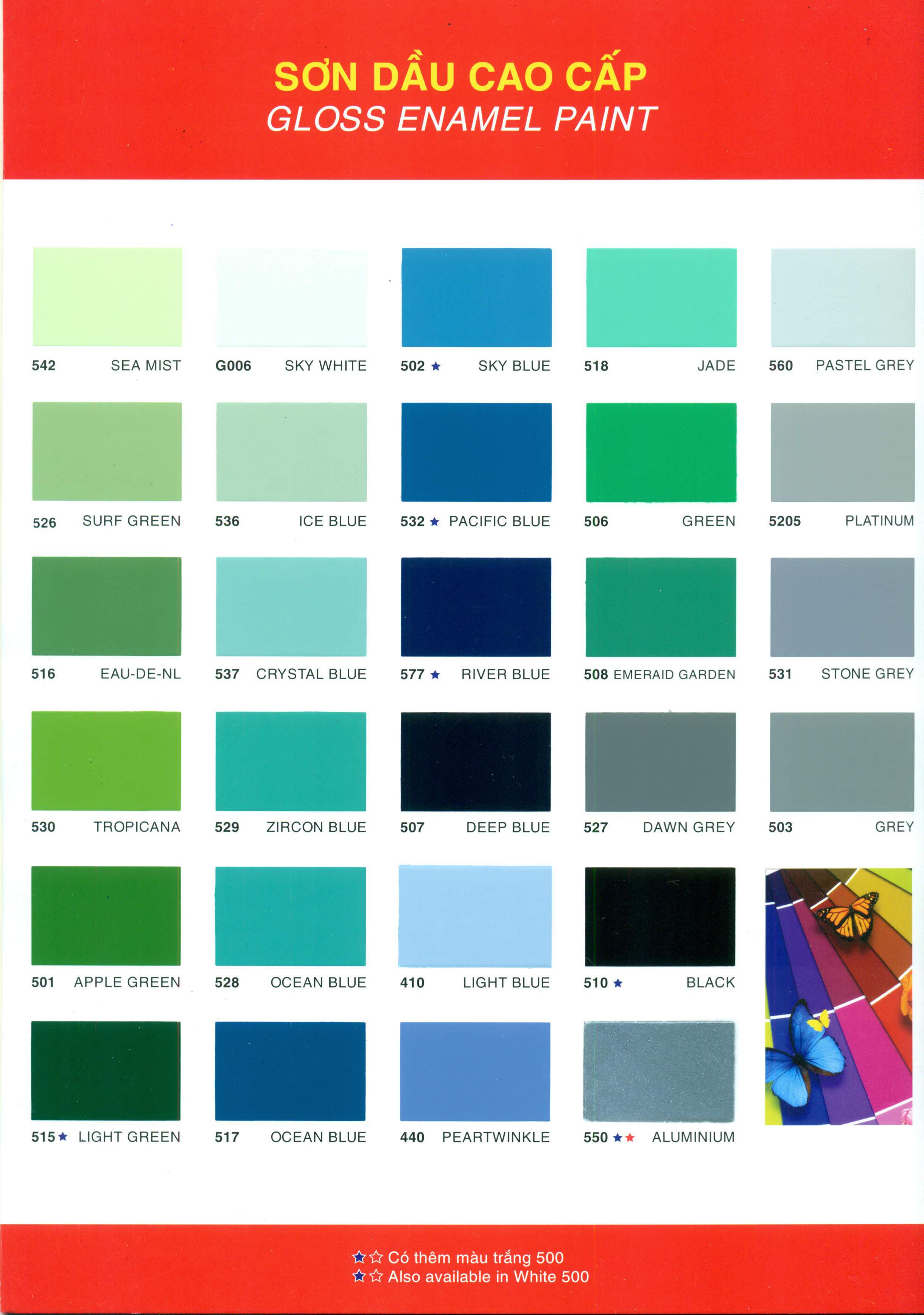 Mã màu sơn dầu Galant: 433 Ivory; 534 Jonquil; 512 Crange; 543 Silver Mist; 513 Dark Cream; 505 Red; 555 Pebble; 520 Lemon Yellow; 524 Cherry Red; 580 New Brown; 509 Yellow; 514 Light Brown; 570 Antique; 522 Oxide Yellow; 519 Burn Brown; 504 Brown; 533 Tangerine; 542 Sea Mist; G006 Sky White; 502 Sky Blue; 518 Jade; 560 Pastel Grey; 526 Surf Green; 536 Ice Blue; 532 Pacific Blue; 506 Green; 5205 Platinum; 516 Eau-De-Nl; 537 Crystal Blue; 577 River Blue; 508 Emeraid Garden; 531 Stone Grey; 530 Tropicana; 529 Zircon Blue; 507 Deep Blue; 527 Dawn Grey; 503 Grey; 501 Apple Green; 528 Pacific Ocean; 410 Light Blue; 510 Black; 515 Light Green; 517 Ocean Blue; 440 Peartwinkle; 550 Aluminium; G001 Apple