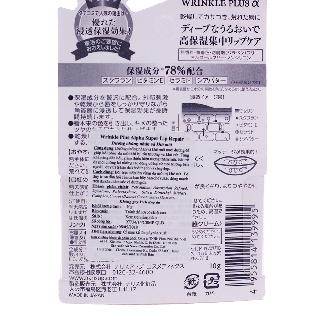 Son dưỡng chống nhăn và khô môi Nhật Bản Naris Wrinkle Plus Alpha Super Lip Repair (10g) – Hàng chính hãng