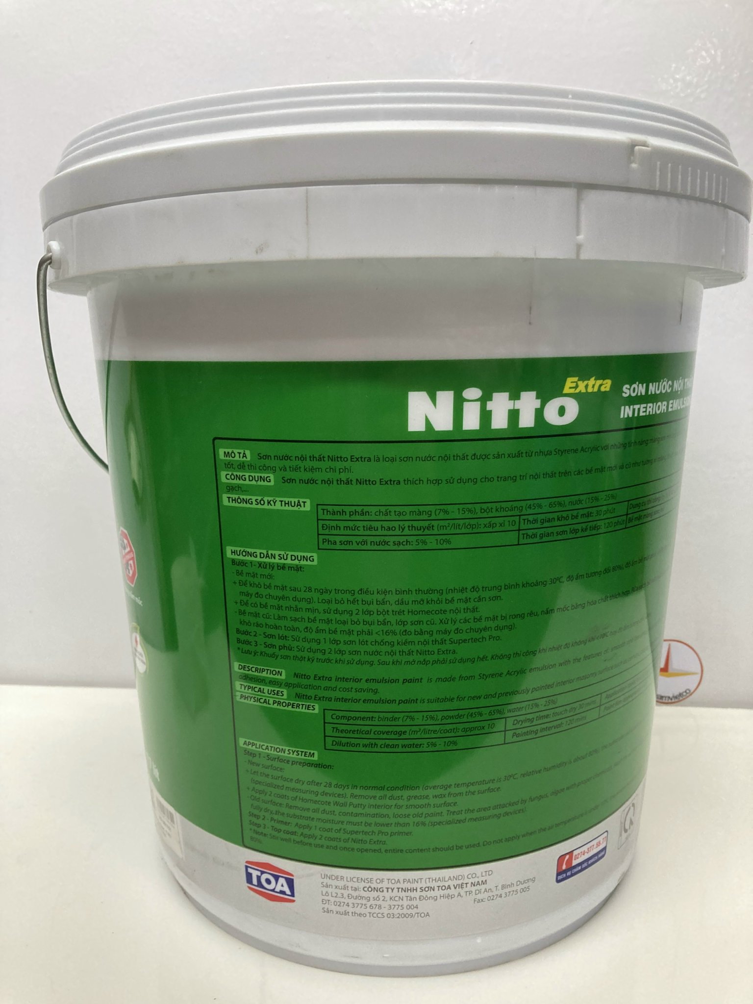 - Có thể pha màu bằng máy pha màu tự động. MỤC ĐÍCH SỬ DỤNG: Sơn nước ToaNitto Extra thích hợp cho việc trang trí nội thất trên các bề mặt mới và cũ như tường xi măng, bê tông, thạch cao, gạch, ngói, tấm xi măng nhẹ,v.v.... ĐẶC TÍNH SẢN PHẨM: Thành phần cấu tạo: Chất tạo màng, bột khoáng, phụ gia & nước. Màu sắc: Nhiều màu Theo bảng màu và quạt màu TCW Bề mặt hoàn thiện: Mờ Thể tích chất rắn: 37 ± 2 (% theo thể tích) Độ phủ lý thuyết: 9.3 – 12.3 m2/lít/lớp Độ phủ thực tế sẽ phụ thuộc vào khả năng dàn trải của màng sơn, độ dày màng sơn khô, bề mặt thi công, tay nghề thợ sơn và lượng sơn hao hụt thực tế khi thi công.