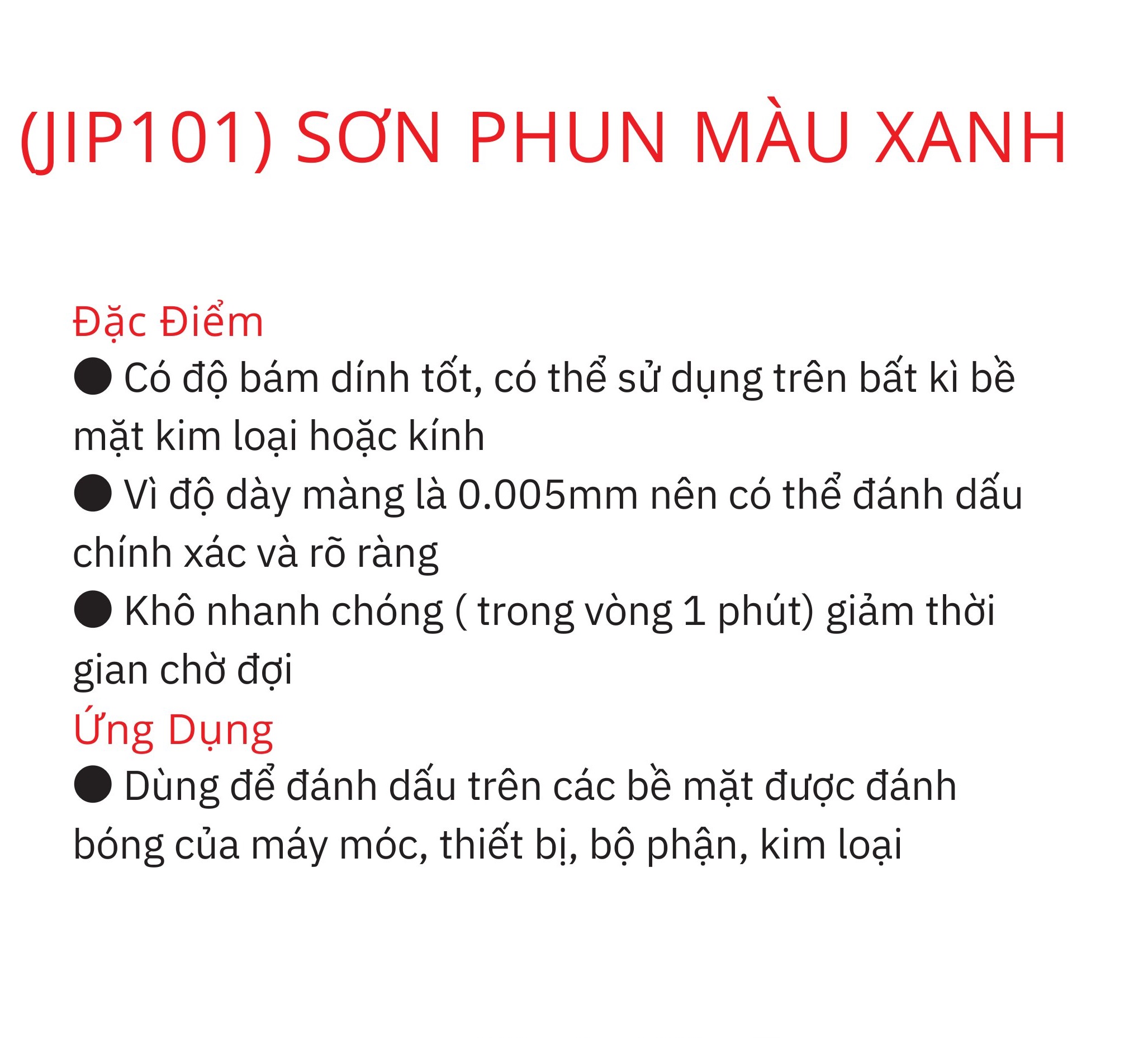 Mua tại TiktokSơn phun màu xanh đánh dấu máy móc thiết bị JIP101 Công dụng Đánh dấu lên các bề mặt đánh bóng kim loại của các máy móc, thiết bị điện, các bộ phận, tấm kim loại Đặc điểm