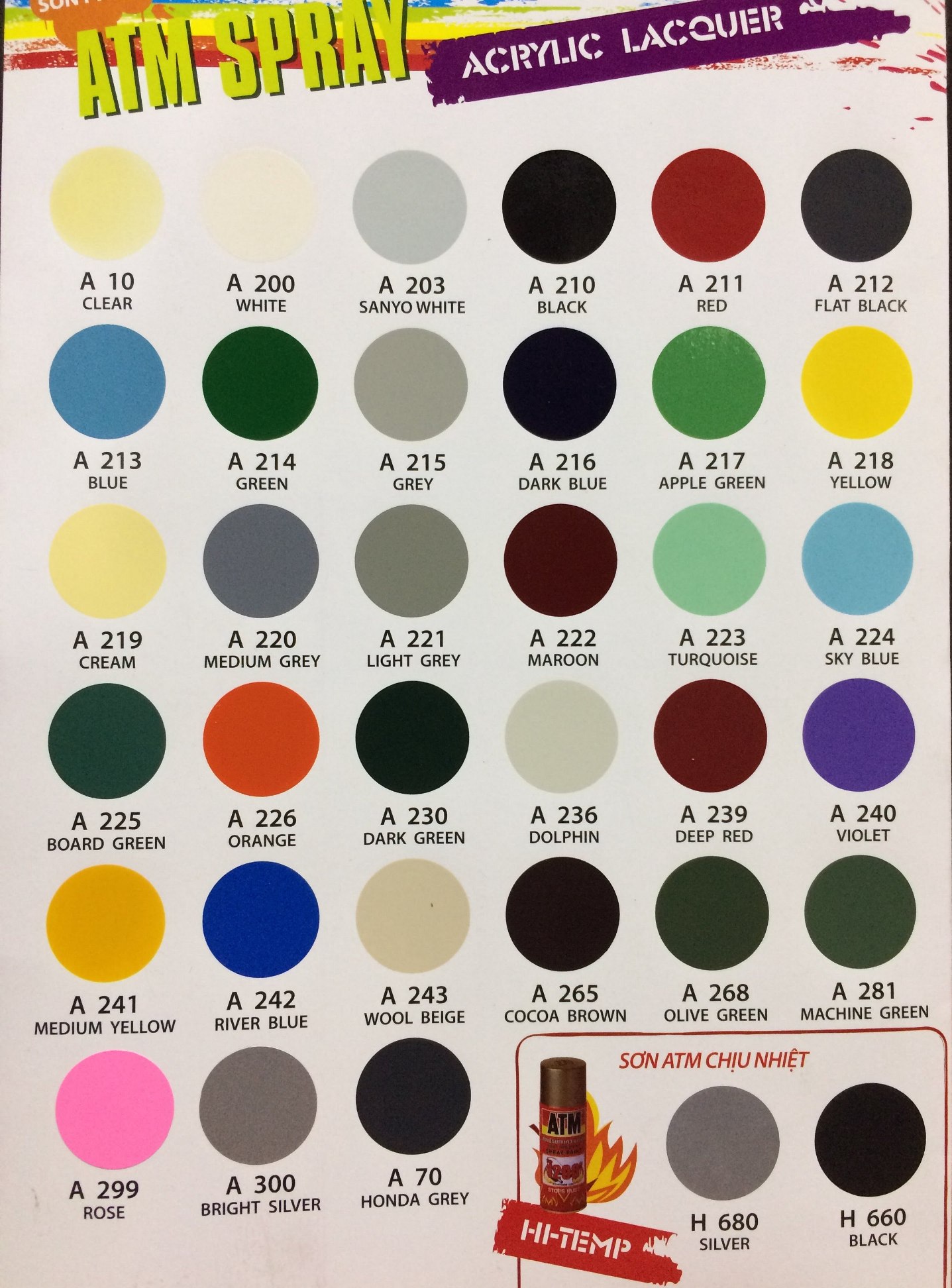 SƠN PHUN “ATM” ACRYLIC: Đặc chế từ hỗn hợp nhựa N/C và ACRYLIC, được đóng gói dưới dạng bình xịt cầm tay rất tiện dụng, dùng sơn để trang trí cho các bề mặt bằng