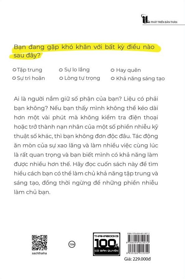 - Khả năng sáng tạo Ai là người nắm giữ số phận của bạn? Liệu có phải bạn không? Nếu bạn thấy m.ình không thể kéo dài hơn một vài phút mà không kiểm tra điện thoại hoặc trở thành nạn nhân của một số phiền nhiễu kỹ thuật số khác, thì bạn không đơn độc đâu. Tác động ăn mòn của sự xao lãng và làm nhiều việc cùng lúc là rất quan trọng và bạn biết m.ình có khả năng làm được nhiều hơn thế. Hãy đọc cuốn sách này để tìm hiểu cách bạn có thể làm chủ khả năng tập trung và sáng tạo, đồng thời ngừng để những phiền nhiễu làm chủ bạn. Sống thông minh nói về: