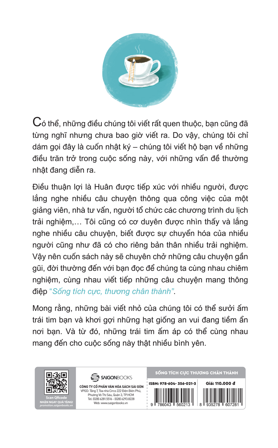 Và bạn biết đấy, đâu có gì quý giá hơn là thương chân thành và cũng không có yêu thương chân thành nào mà không bắt đầu bằng suy nghĩ cùng lối sống tích cực. Mong rằng, những bài viết nhỏ của 2 tác giả có thể sưởi ấm trái tim bạn và khơi gợi những hạt giống an vui đang tiềm ẩn nơi bạn. Và từ đó, những trái tim ấm áp có thể cùng nhau mang đến cho cuộc sống này thật nhiều bình yên.
