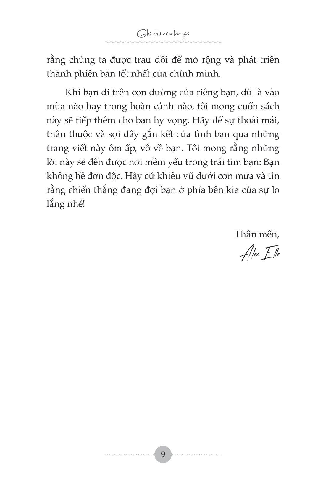 Cuốn sách này sẽ giúp bạn đưa ra quyết định mang tính cách mạng để trở nên vĩ đại và không thu m.ình lại chỉ vì sự thoải mái hay hài lòng từ người khác. Từng dòng từng chữ như thể động viên bạn hãy cho phép m.ình nở hoa rực rỡ mà không hối tiếc, hãy khiêu vũ dưới cơn mưa và cứ hét lên, cứ khóc thỏa sức chỉ cần bạn nhớ rằng bạn là ai trong từng bước đi. Và khi bạn đi trên con đường của riêng bạn, dù là vào mùa nào hay trong hoàn cảnh nào, Bizbooks mong cuốn sách này sẽ tiếp thêm cho bạn hy vọng. Hãy để sự thoải mái, thân thuộc và sợi dây gắn kết qua những trang viết này ôm ấp, vỗ về bạn.