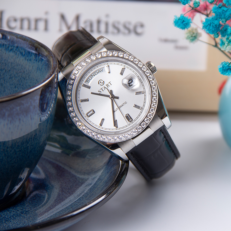 ★Thương hiệu:START★ Đặc điểm:Mặt số nạm kim cương,ngày Khả năng chống thấm nước: 50 mét không thấm nước Loại lõi đồng hồ: Lõi đồng hồ cơ học tự động Đường kính vỏ đồng hồ: 40mm