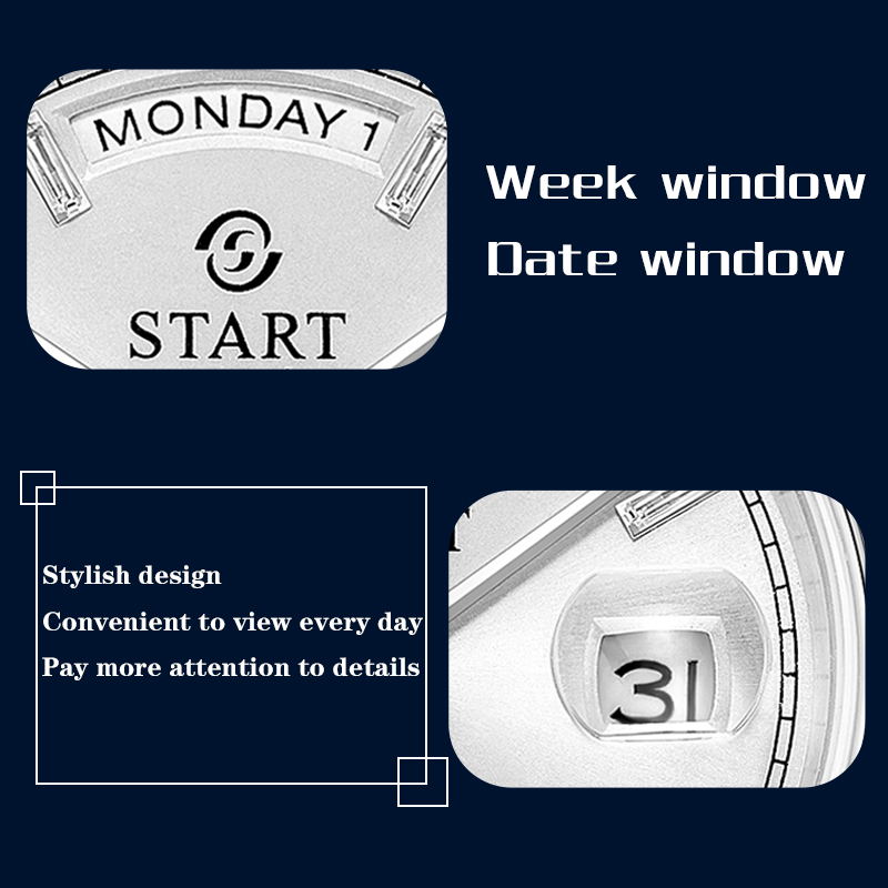 ★Thương hiệu:START★ Đặc điểm: Mặt số nạm kim cương,ngày,Tuần Khả năng chống thấm nước: 50 mét không thấm nước Loại lõi đồng hồ: Lõi đồng hồ cơ học tự động Đường kính vỏ đồng hồ: