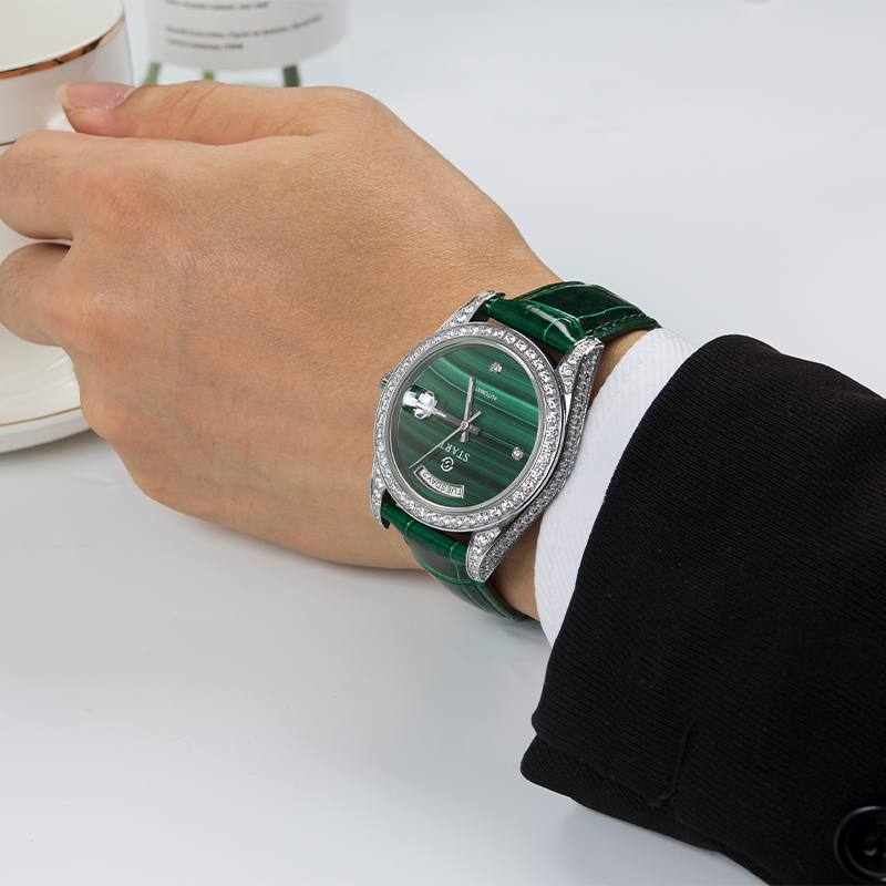 ★Thương hiệu:START★ Đặc điểm: Mặt số malachit tự nhiên, vỏ nạm kim cương, dạ quang,ngày,Tuần,kim giờ dạ quang Khả năng chống thấm nước: 50 mét không thấm nước Loại lõi đồng hồ: Lõi đồng hồ