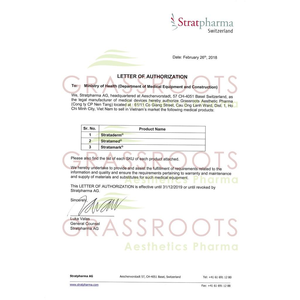 - Strataderm là sản phẩm hỗ trợ tốt đối với các vết sẹo lồi, sẹo lâu năm được nhiều chuyên gia da liễu khuyên dùng. Sản phẩm được sản xuất theo công nghệ mới từ công ty dược nổi tiếng Stratapharma Thụy Sĩ, kết cấu dạng gel không nhờn dính trên da.