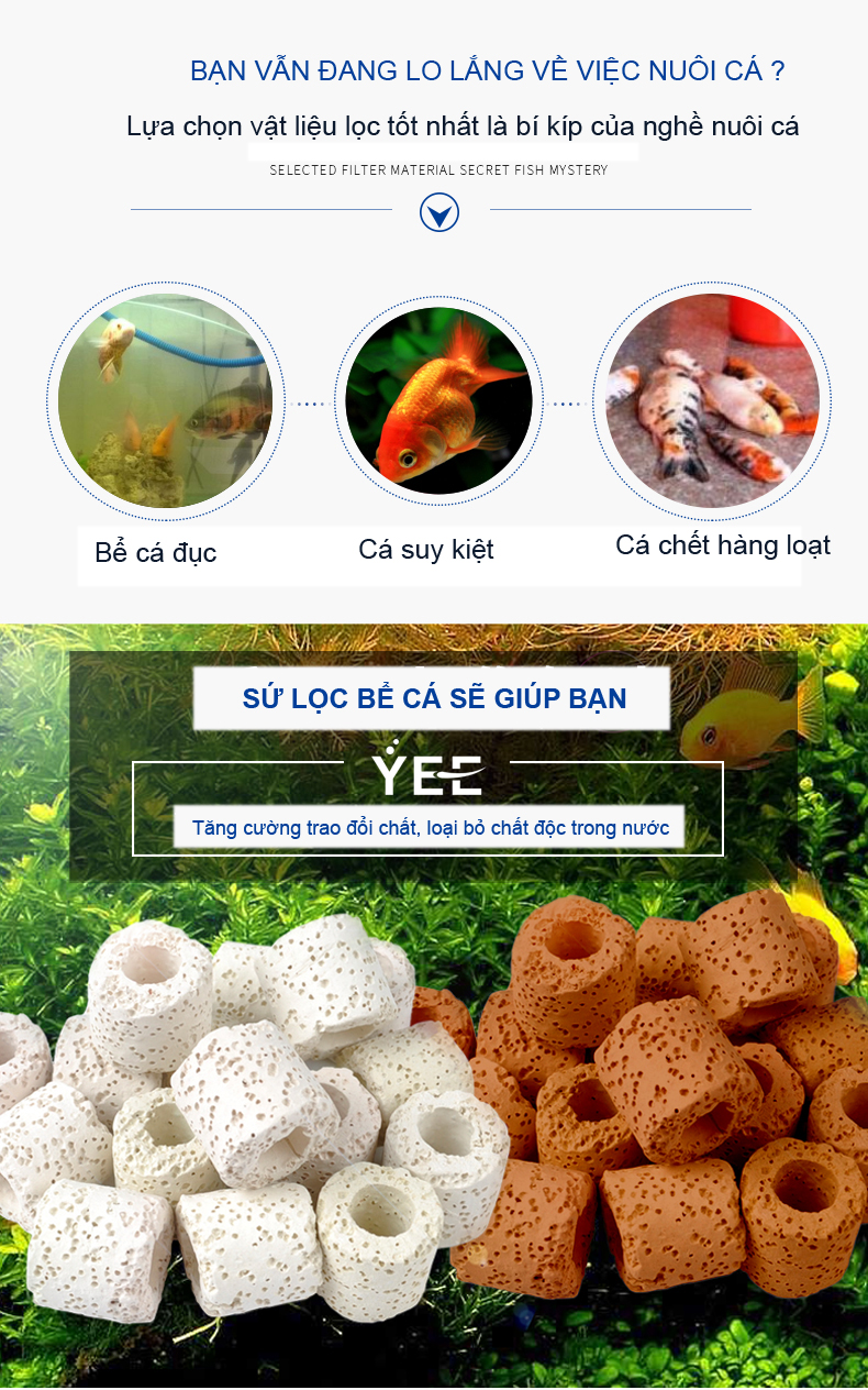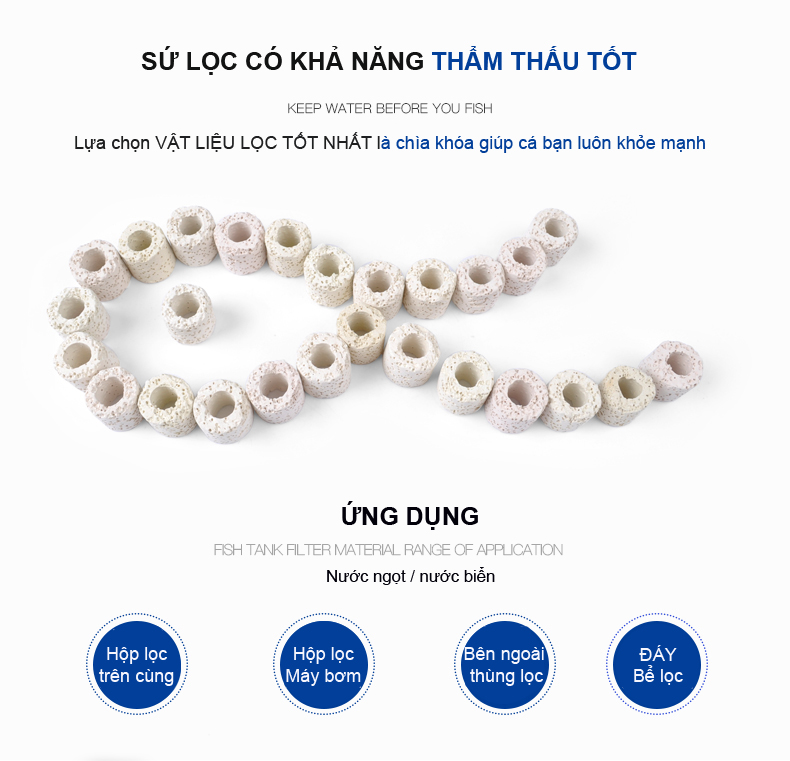 - Sứ lọc dùng khoảng bao lâu ? TL: 6 tháng anh chị lại thay 1 lần nhé Vật Liệu Lọc Sứ Lỗ Xử Lý Nước Giúp Cải Thiện, Bổ Sung Khoáng Chất Và Duy Trì Chất Lượng Nước Tốt Sứ lỗ hay còn gọi là sứ nhẫn, vật liệu lọc vi sinh hữu hiệu cho hồ cá •Sứ lỗ không gây tăng hay giảm pH, hút nước chậm nhưng giữ ẩm rất lâu nên ngoài công dụng là nơi trú ngụ vi sinh còn là giá thể trồng cây. So sánh với sứ thanh thì chúng không cho phép nước đi xuyên nhanh chóng nhưng bù lại giá rẻ hơn nhiều •Trọng lượng túi : 1.5KG / 2KG •Kích thước sứ lỗ : 1.5x1.5cm •Công dụng: