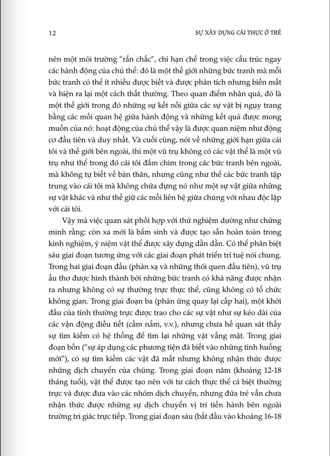… Trong những tháng đầu tiên của đời người, chừng nào sự đồng hóa vẫn tập trung vào hoạt động của chủ thể, thì vũ trụ không thể hiện vật thường trực lẫn không gian khách quan, cũng không thể hiện thời gian liên kết các sự kiện đúng với tư cách sự kiện lẫn tính nhân quả nằm bên ngoài chính hành động.
