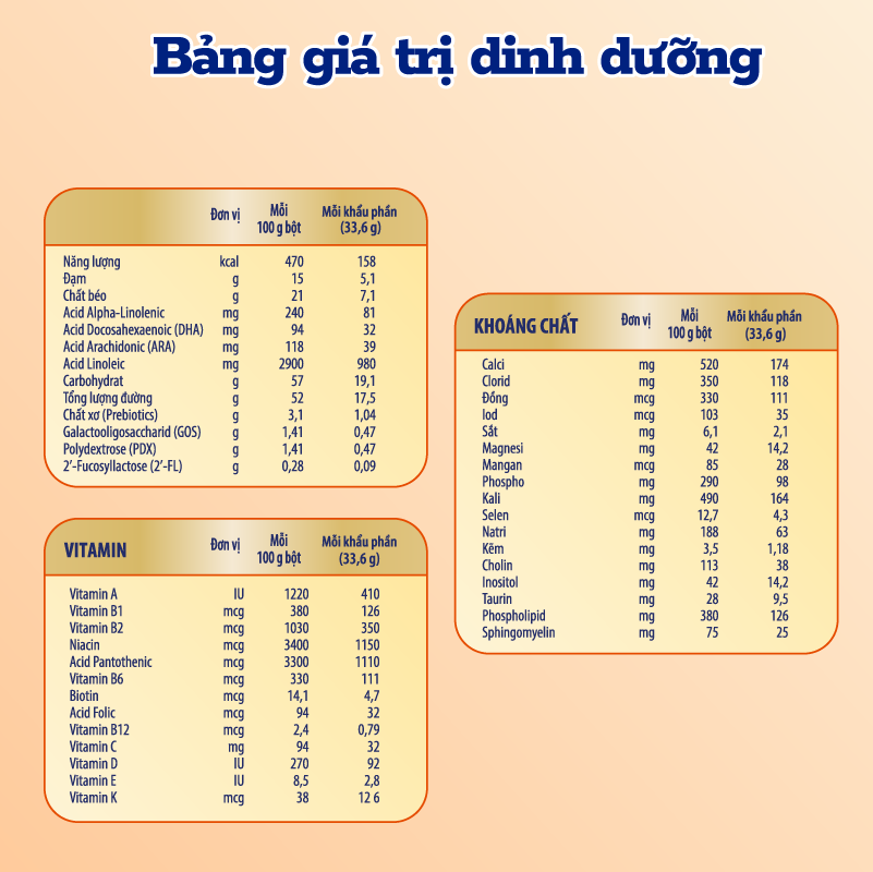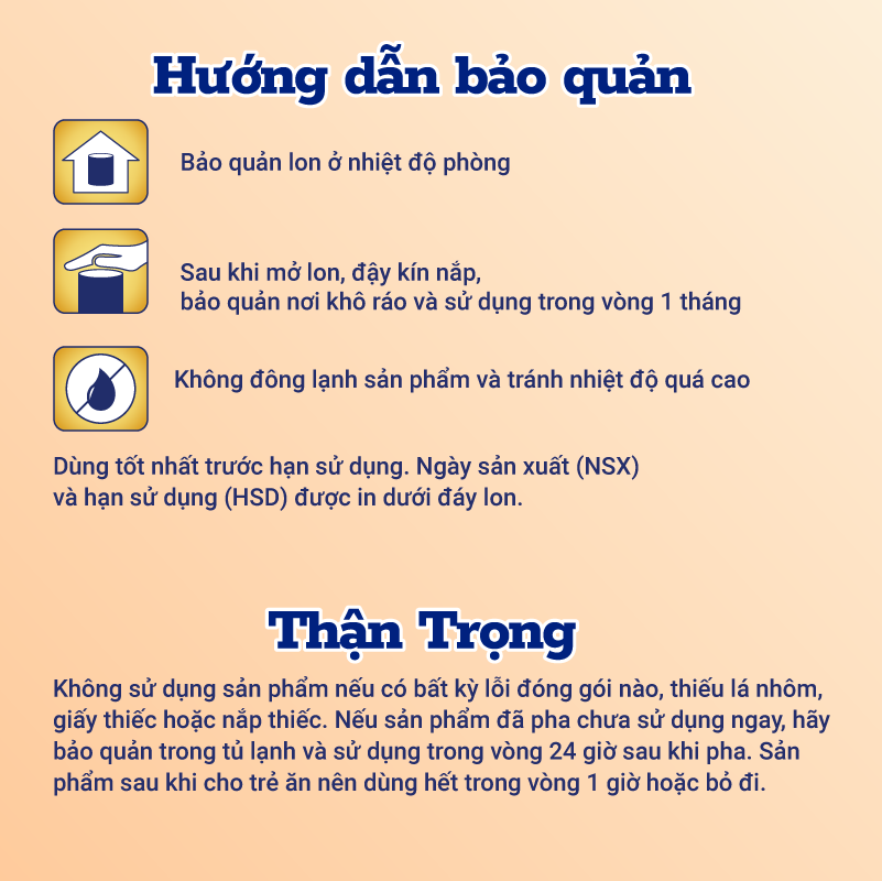 - MFGM là lớp màng bao bọc quanh các giọt chất béo sữa được tìm thấy trong sữa mẹ" "THÀNH PHẦN Lactose, sữa bột tách béo, dầu thực vật, sữa bột nguyên chất, đạm whey tinh chất (nguồn của MFGM; 7,6%), galactooligosaccharid, polydextrose, các khoáng chất (calci carbonat, natri citrat, tricalci phosphat, kali clorid, kali hydroxyd, magnesi phosphat, magnesi clorid, sắt sulphat, kẽm sulphat, đồng sulphat, mangan sulphat, natri iodid, và natri selenit), chất nhũ hóa (lecithin đậu nành), dầu đơn bảo là nguồn của acid arachidonic (ARA) và acid docosahexaenoic (DHA), sirô mật bắp, các vitamin (natri ascorbat, cholin clorid, alpha-tocopheryl acetat, niacinamid, retinyl palmitat, phytonadion, calci pantothenat, acid ascorbic, cholecalciferol, cyanocobalamin, riboflavin, thiamin hydroclorid, pyridoxin hydroclorid, acid folic và biotin), 2’-fucosyllactose, inositol, taurin, chất chống oxy hóa (ascorbyl palmitat). Sản phẩm có chứa thành phần nguồn gốc từ sữa và đậu nành." "THẬN TRỌNG Không sử dụng sản phẩm nếu có bất kỳ lỗi đóng gói nào, thiếu lá nhôm, giấy thiếc hoặc nắp thiếc. Nếu sản phẩm đã pha chưa sử dụng ngay, hãy bảo quản trong tủ lạnh và sử dụng trong vòng 24 giờ sau khi pha. Sản phẩm sau khi cho trẻ ăn nên dùng hết trong vòng 1 giờ hoặc bỏ đi. HƯỚNG DẪN BẢO QUẢN Bảo quản lon ở nhiệt độ phòng. Sau khi mở lon, đậy kín nắp, bảo quản nơi khô ráo và sử dụng trong vòng 1 tháng. Không đông lạnh sản phẩm và tránh nhiệt độ quá cao. Dùng tốt nhất trước hạn sử dụng. Ngày sản xuất (NSX) và hạn sử dụng (HSD) được in dưới đáy lon. HƯỚNG DẪN SỬ DỤNG • Để pha 1 ly Enfagrow A+ NeuroPro 2 C-Sec, cho 7 muỗng gạt (khoảng 33,6 g bột) vào 210 ml nước ấm (40°C) đã được đun sôi trong 5 phút trước đó để pha được 235 ml hỗn hợp. • Khuấy hoặc lắc đều. Có thể đựng bột trong cốc ăn cho trẻ. • Đảm bảo tất cả các dụng cụ cho ăn được rửa sạch và tiệt trùng kỹ lưỡng trước khi pha. • Bổ sung 2 ly mỗi ngày. • Dùng muỗng có trong lon để đong bột. Bảo quản muỗng KHÔ RÁO trong lon. Độ pha loãng thông thường: 1 muỗng gạt (khoảng 4,8 g) bột Enfagrow A+ NeuroPro 2 C-Sec cho vào 30 ml nước ấm (40°C) đã được đun sôi trước đó trong 5 phút. Hạn Sử Dụng : 24 tháng Sản xuất và phân phối theo giấy phép của Mead Johnson Hoa Kỳ. Xuất xứ: Thái Lan CHÚ Ý: Sữa mẹ là thức ăn tốt nhất cho sức khỏe và sự phát triển toàn diện của trẻ nhỏ. Các yếu tố chống nhiễm khuẩn. đặc biệt là kháng thể chỉ có trong sữa mẹ có tác dụng giúp trẻ phòng chống bệnh tiêu chảy. nhiễm khuẩn đường hô hấp và một số bệnh nhiễm khuẩn khác. Chỉ sử dụng sản phẩm này theo chỉ dẫn của bác sĩ. Pha chế theo đúng hướng dẫn. Cho trẻ ăn bằng cốc. thìa hợp vệ sinh."