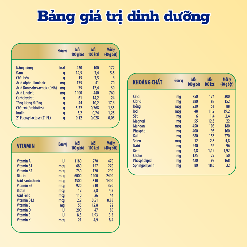 THÀNH PHẦN: Sữa bột nguyên kem bổ sung Vitamin A và D3, bột sữa (bột sữa tách béo, hỗn hợp dầu thực vật (dầu cọ, dầu bắp, dầu hạt cải, dầu hướng dương), glucose syrup,