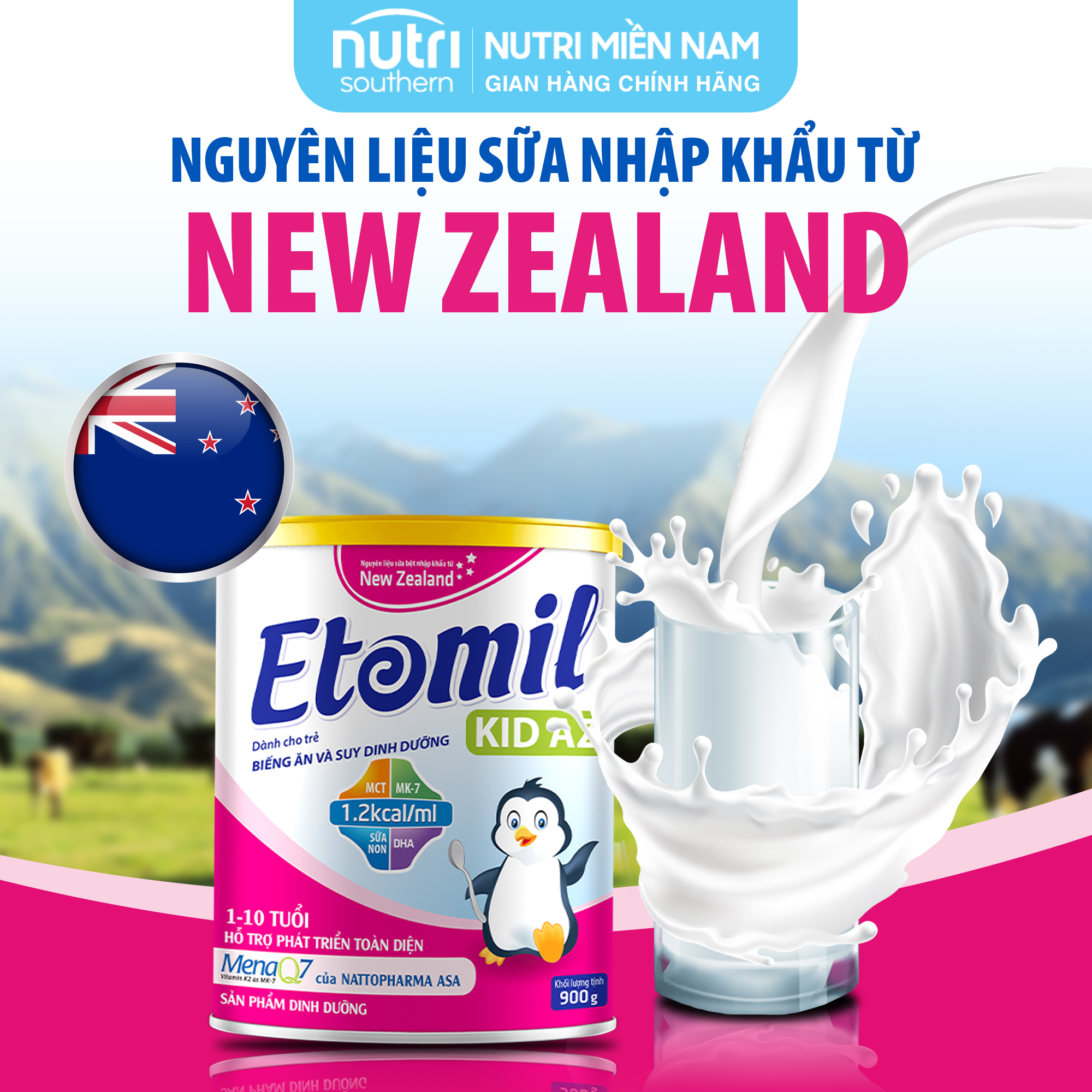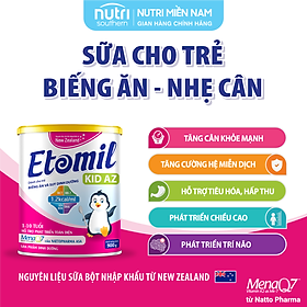 Sữa Tăng Cân Cho Bé 1-10 Tuổi ETOMIL KID AZ - Sữa Năng Lượng Cao Cho Trẻ Biếng Ăn, Nhẹ Cân     THÀNH PHẦN: Năng lượng (Energy) 458 Kcal (1.2kcal/ml), Protein 15g, Chất béo 18g, Axit Linoleic (Omega 6) 1230mg, Axit a-Linoleic (Omega 3) 170mg, Carbohydrate 59g, DHA 12.6mg, MCT 163mg, Choline 52.8mg, Taurine 7.7mg, Lysine 649mg, Colostrum 300mg, MK-7 (MenaQ7) 48mcg, Chất xơ hòa tan (FOS/Inulin) 3000mg, Natri 156mg, Kali 592mg, Canxi 650mg, Photpho 458mg, Magie 65.2mg, Sắt 6.5mg, Kẽm 3.5mg, Đồng 344mcg, Iod 59mcg, Mangan 40.5mcg, Selen 6.1mcg, Vitamin A 1221 IU, Vitamin D3 221IU, Vitamin E 3.2mg, Vitamin K1 34.9mcg, Vitamin C 48.3mg, Vitamin B1 540mcg, Vitamin B2 770mcg, Vitamin B6 380 mcg, Vitamin B12 1.49mcg, Axit Folic 72.7mcg, Axit Pantothenic 3450mcg, Biotin 40.1mcg, Niacin 1300mcg.     CÔNG DỤNG SẢN PHẨM -Etomil Kid AZ là sản phẩm dinh dưỡng dành cho trẻ từ 1 - 10 tuổi. -Etomil Kid AZ đáp ứng nhu cầu năng lượng tăng cao của trẻ biếng ăn, suy dinh dưỡng, giúp cải thiện tình trạng suy dinh dưỡng và mau chóng phục hồi sức khỏe.       ĐỐI TƯỢNG SỬ DỤNG: -Trẻ từ 1 – 10 tuổi. -Đặc biệt thích hợp với: Trẻ suy dinh dưỡng, gầy yếu, biếng ăn. Trẻ cần bổ sung năng lượng, đạm và vi chất vào khẩu phần ăn.   BẢO QUẢN: -Bảo quản nơi khô ráo, sạch sẽ, thoáng mát, tránh ánh nắng trực tiếp. Lon sữa đã mở phải được đóng kín và sử dụng hết trong vòng 3 tuần   NGUỒN GỐC NGUYÊN LIỆU: -Khi nói đến ngành công nghiệp thực phẩm, nguồn gốc nguyên liệu cực kì quan trọng quyết định đến hiệu quả sử dụng, cũng như giá trị của sản phẩm. -Trong sản phẩm Etomil những nguyên liệu sữa và các vitamin, khoáng chất được lựa chọn từ các nhà cung ứng hàng đầu và có uy tín lâu năm trên thế giới từ New Zealand, Na uy và Mỹ. -Đặc biệt MenaQ7 là một thương hiệu duy nhất có thành phần MK-7 (Vitamin K2) được cấp hơn 30 bằng sáng chế tại Mỹ, Châu Âu, Nhật Bản, Australia…và nghiên cứu lâm sàng cho thấy hiệu quả trong việc giúp tăng mật độ xương trên trẻ em và người lớn.   HƯỚNG DẪN SỬ DỤNG: -Pha 5 muỗng gạt (tương đương 48g) với 190ml nước ấm chín được 1 ly khoảng 215ml -Ngày uống 2-3 ly hoặc theo hướng dẫn của cán bộ y tế -Sản phẩm sau khi pha nên cho trẻ ăn ngay và dùng hết trong vòng 1 giờ. Không cho trẻ ăn lại phần thừa của bữa trước.