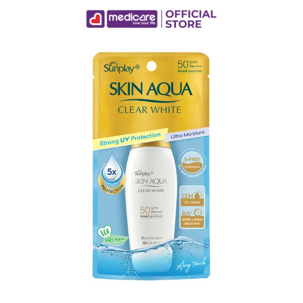 Kem chống nắng dưỡng da trắng mượt Sunplay Skin Aqua Clear White bảo vệ da, ngăn ngừa sạm da, nám da, đốm nâu, tránh nguy cơ ung thư da. Thiết kế nhỏ gọn, tiện lợi