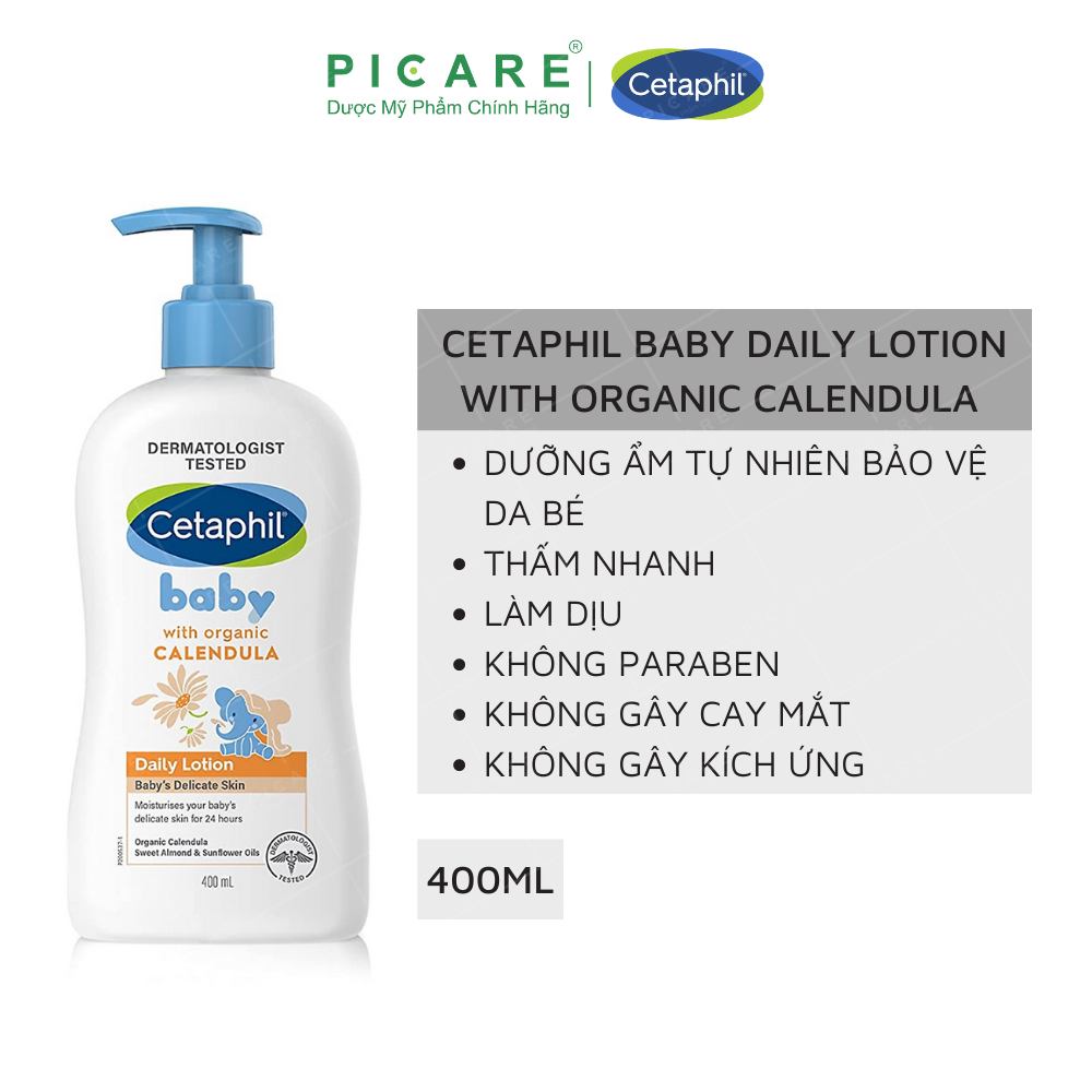 Sữa Dưỡng Ẩm Dịu Nhẹ Hằng Ngày Cho Bé Cetaphil Baby Daily Lotion with Organic Calendula 400ml là dòng dưỡng ẩm toàn thân đến từ thương hiệu dược mỹ phẩm Cetaphil của Canada, với chiết xuất từ dầu của hạt hạnh nhân và dầu hoa hướng dương giúp cung cấp độ ẩm cho da, nuôi dưỡng làn da mềm mịn, tránh bị khô da, bảo vệ làn da hoàn hảo cho trẻ sơ sinh và trẻ nhỏ. Ngoài ra, thành phần Calendula hữu cơ chiết xuất từ hoa cúc vạn thọ trong Sữa Dưỡng Ẩm Cetaphil Baby Daily Lotion còn ngăn kích ứng, sát khuẩn, ngừa viêm và làm lành da, giảm lại các triệu chứng nổi mẩn đỏ, rôm sảy, ngứa ngáy và hăm.